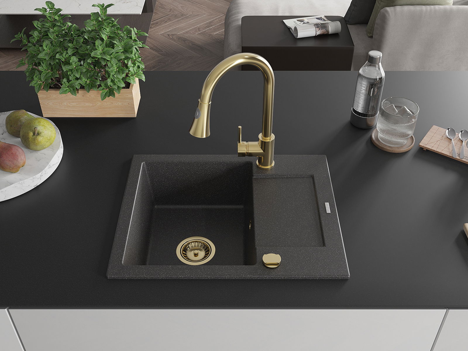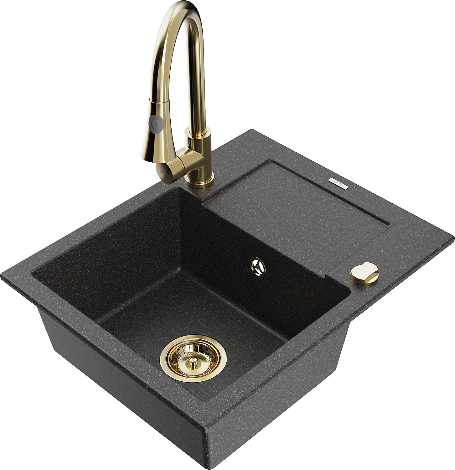 Mexen Enzo fregadero de granito de 1 seno con escurridor y grifo de cocina Elia, negro moteado - 6506-76-670101-50