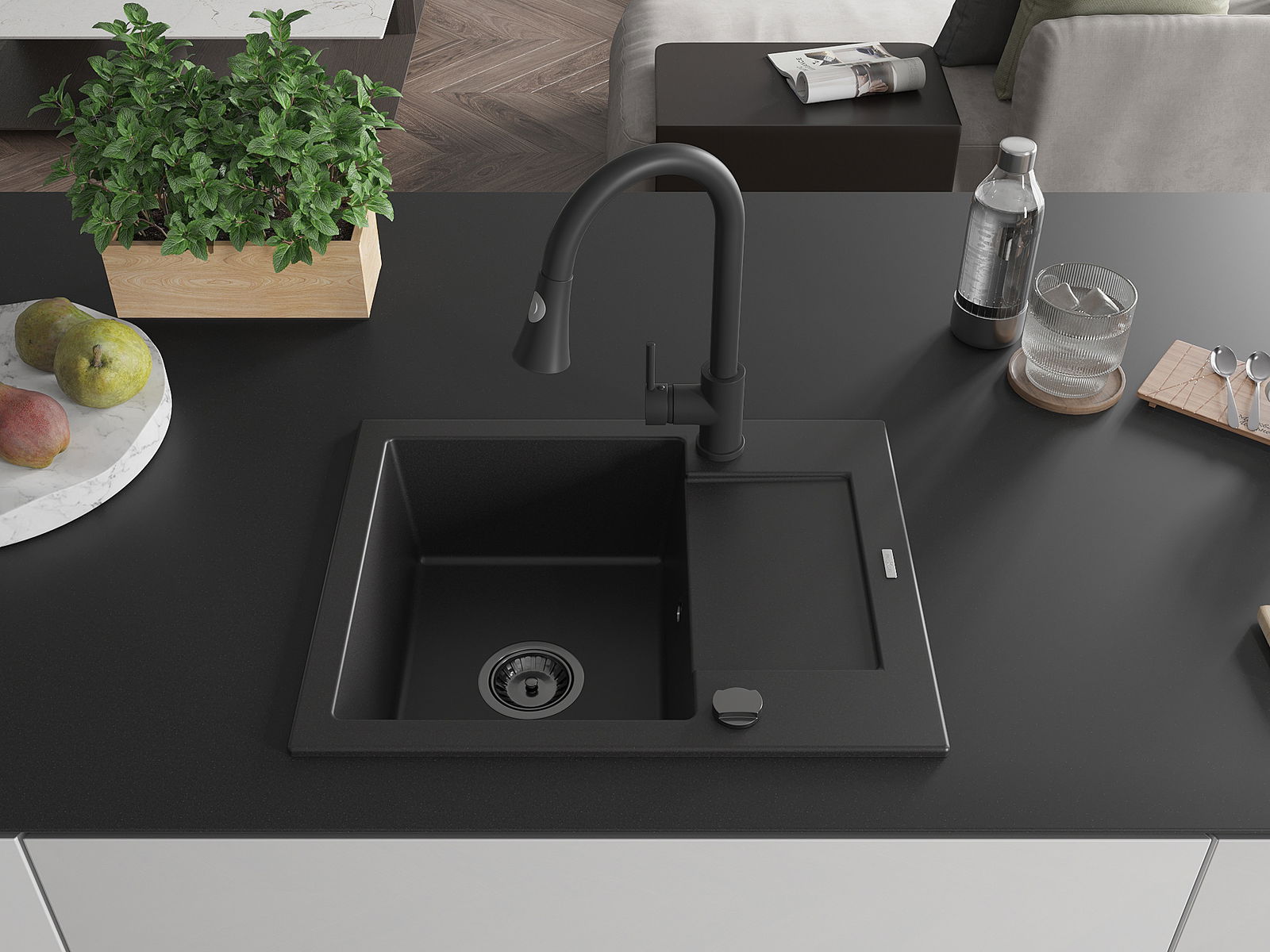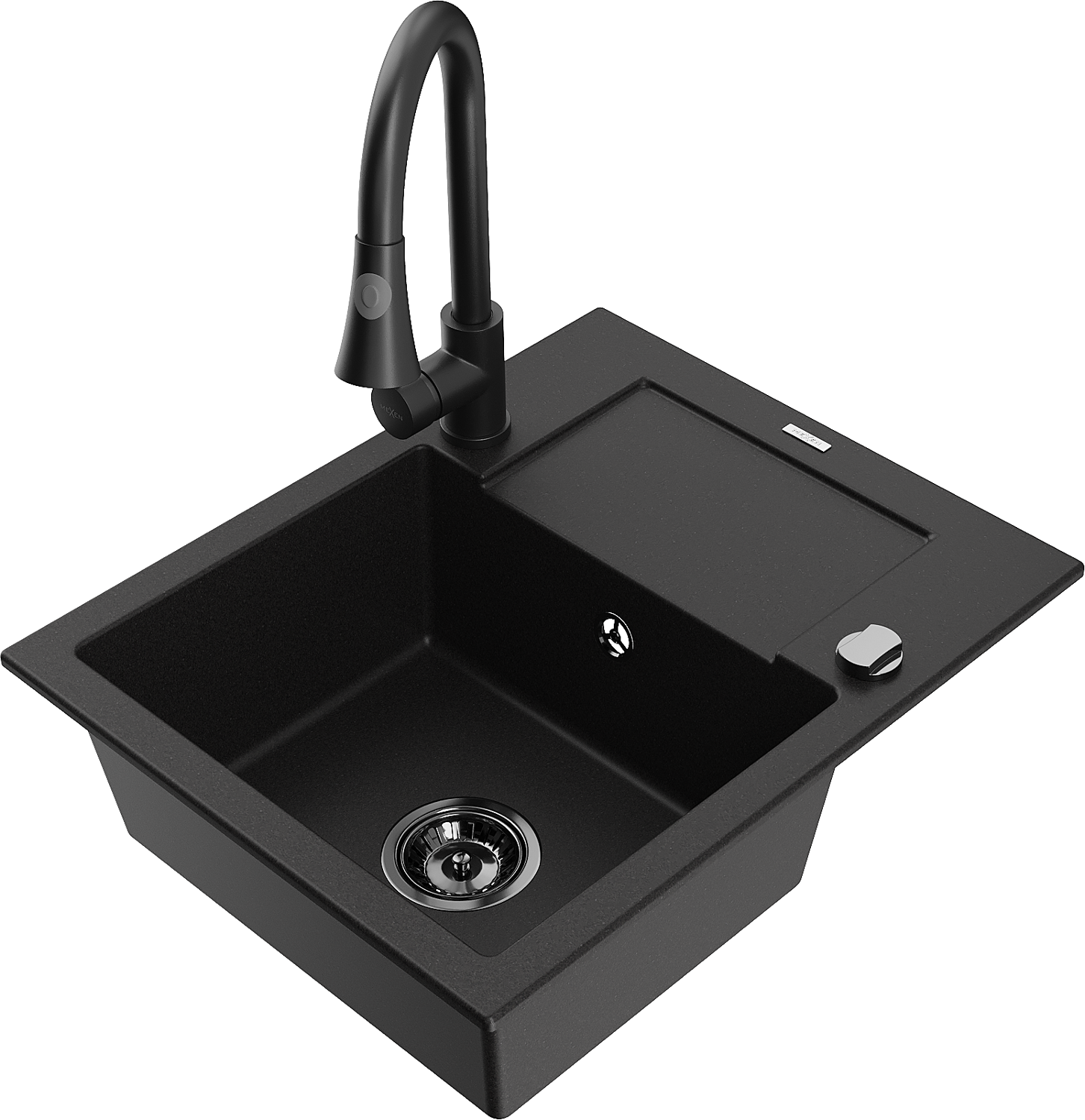 Mexen Enzo fregadero de granito de 1 cubeta con escurridor y grifo de cocina Elia, negro - 6506-77-670101-70-B