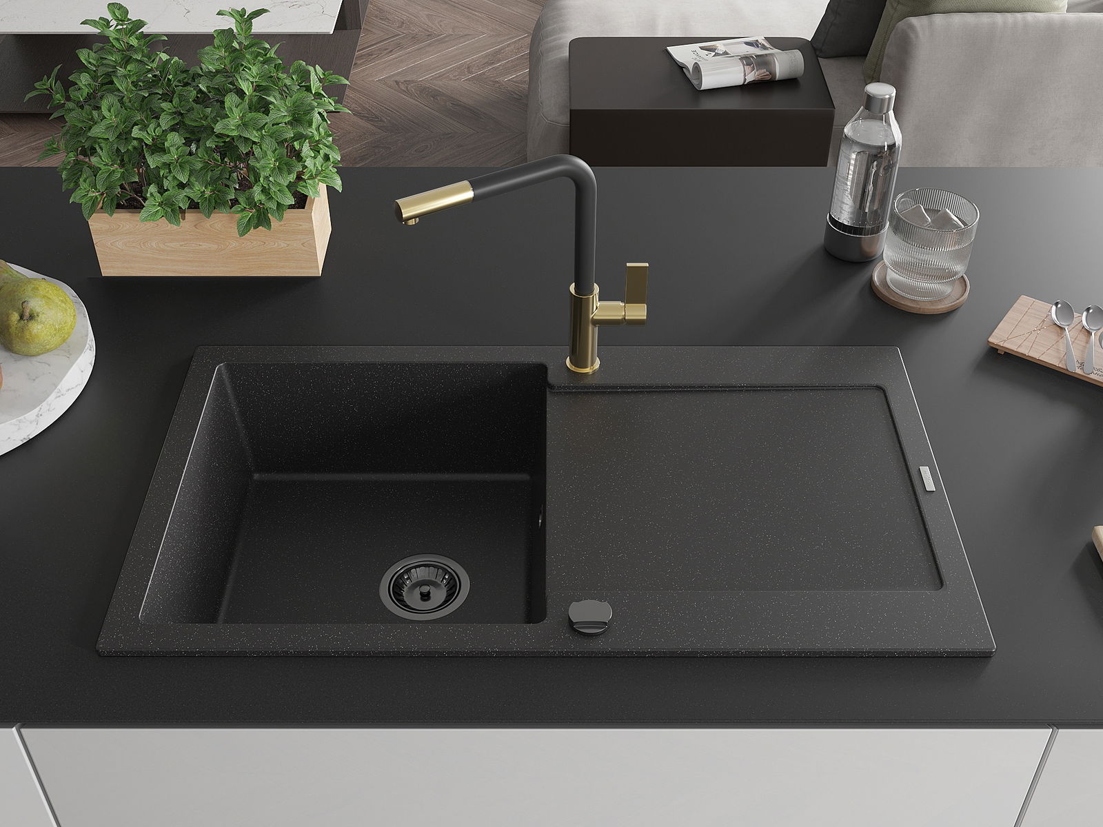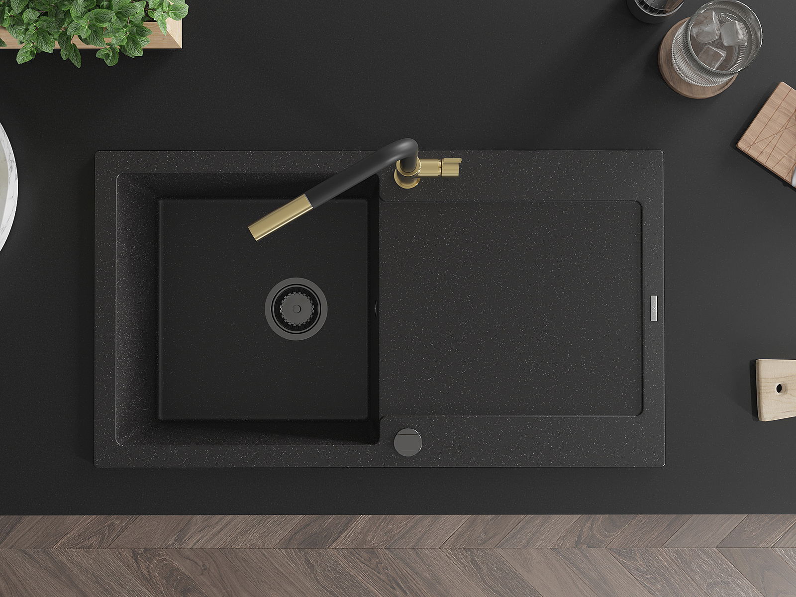 El fregadero está hecho de granito de alta calidad. Es un complemento elegante y, sobre todo, práctico para cualquier cocina, independientemente de su estilo. La alta calidad y durabilidad del granito aseguran un uso prolongado durante años.