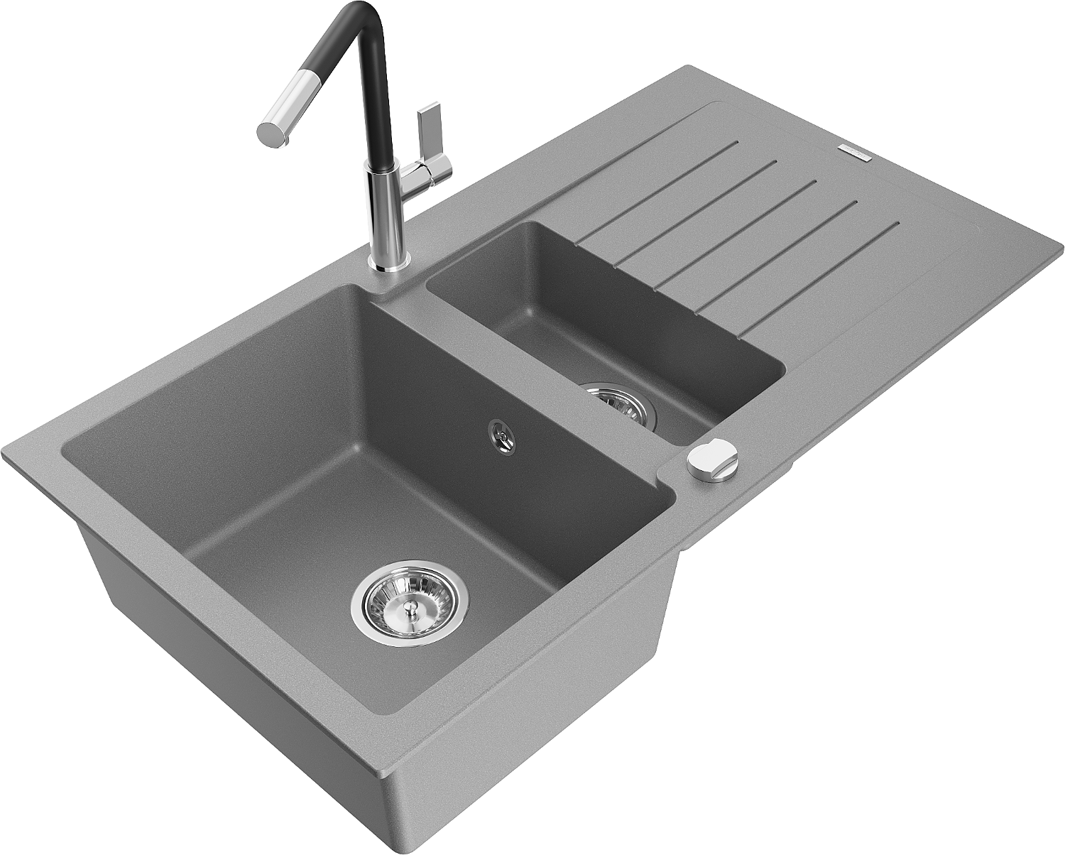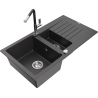 Mexen Matias fregadero de granito de 1,5 senos con escurridor y grifo de cocina Flora, gris - 6502-71-670401-07