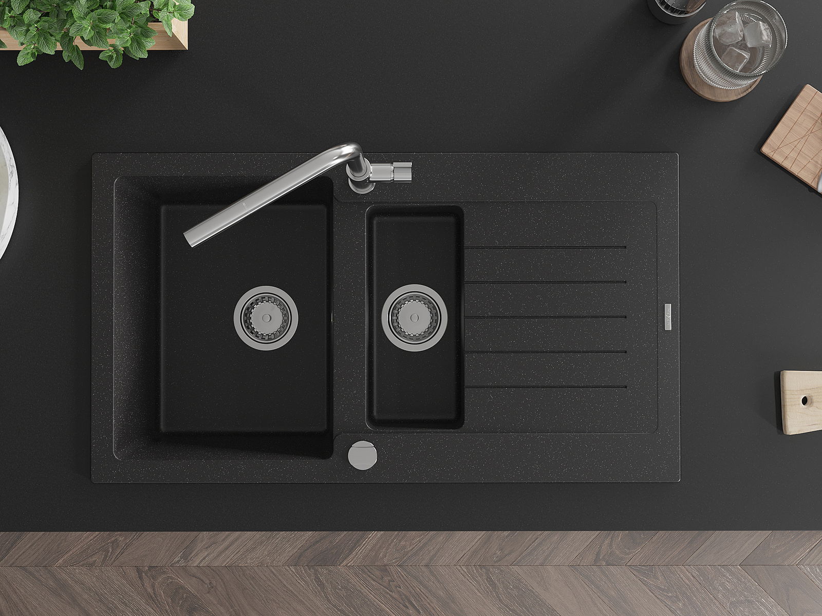 Mexen Matias fregadero de granito de 1,5 senos con escurridor y grifo de cocina Flora, negro/plata - 6502-73-670401-00