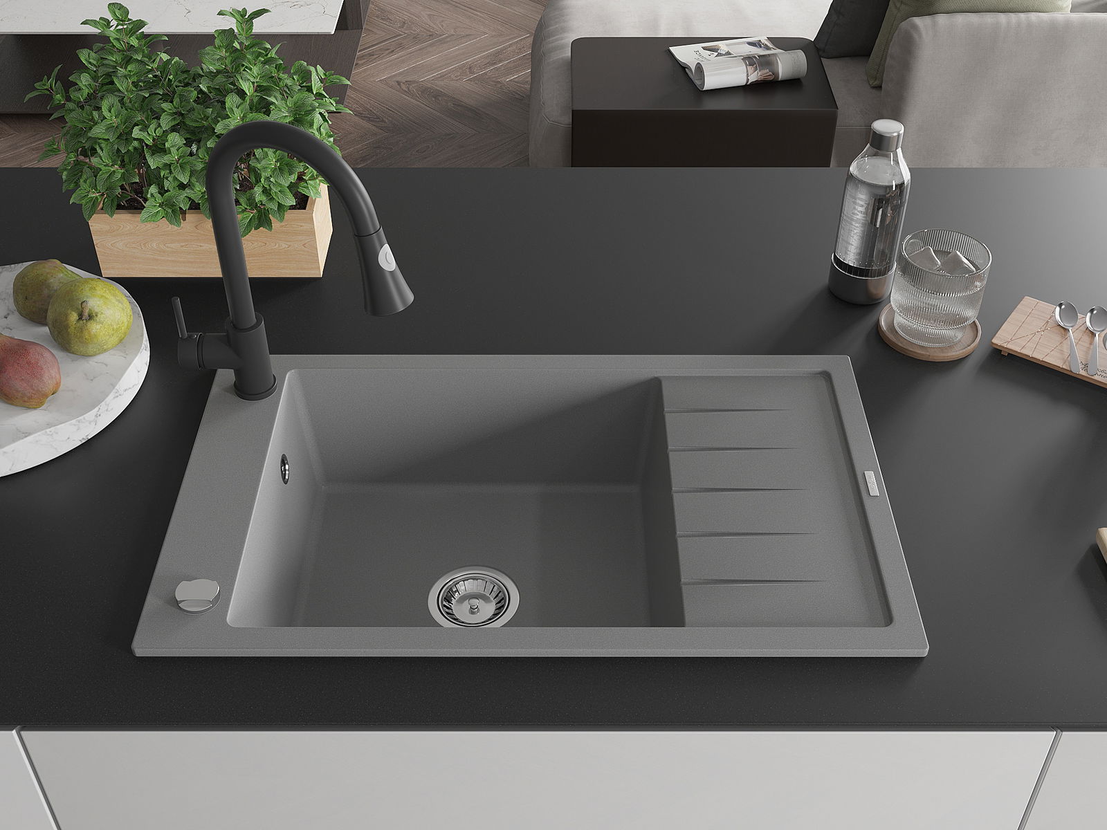 El fregadero está hecho de granito de alta calidad. Constituye un complemento elegante y, sobre todo, práctico para cualquier cocina, independientemente de su estilo. La alta calidad y durabilidad del granito aseguran un uso durante muchos años.