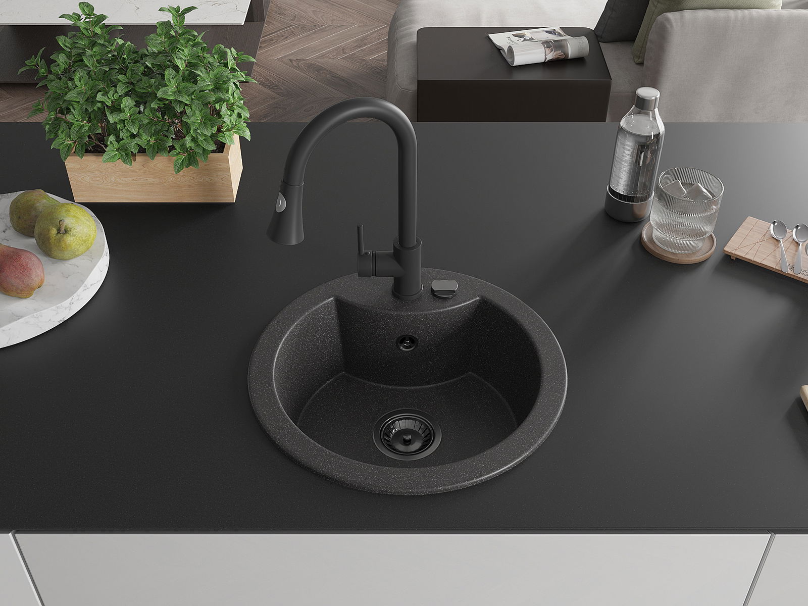 El fregadero está hecho de granito de alta calidad. Constituye un complemento elegante y, sobre todo, práctico para cualquier cocina, independientemente de su estilo. La alta calidad y durabilidad del granito aseguran un uso durante muchos años.