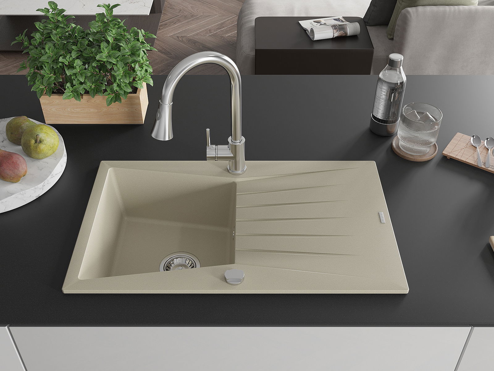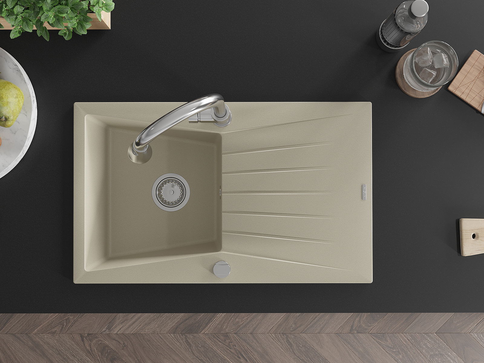 El fregadero está hecho de granito de alta calidad. Es un complemento elegante y, sobre todo, práctico para cualquier cocina, independientemente de su estilo. La alta calidad y durabilidad del granito aseguran un uso prolongado durante años.