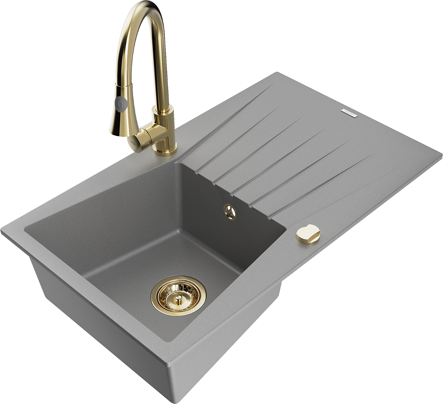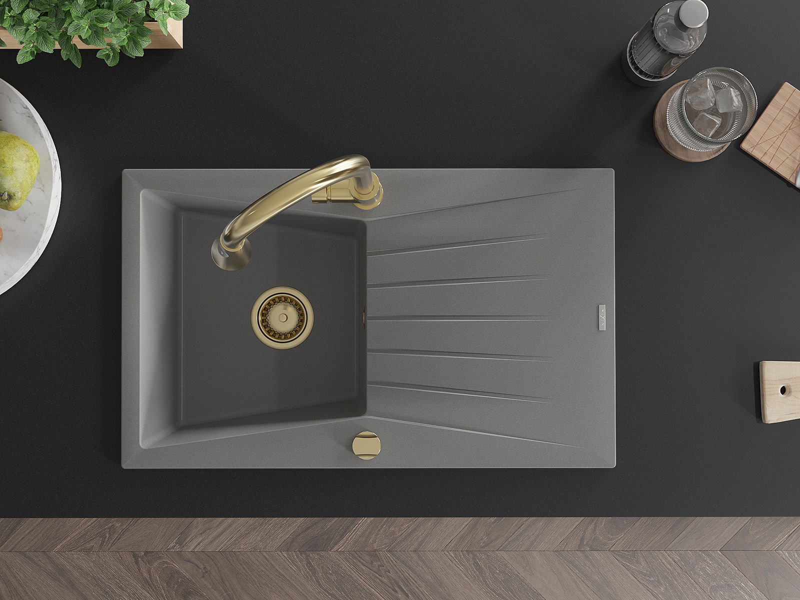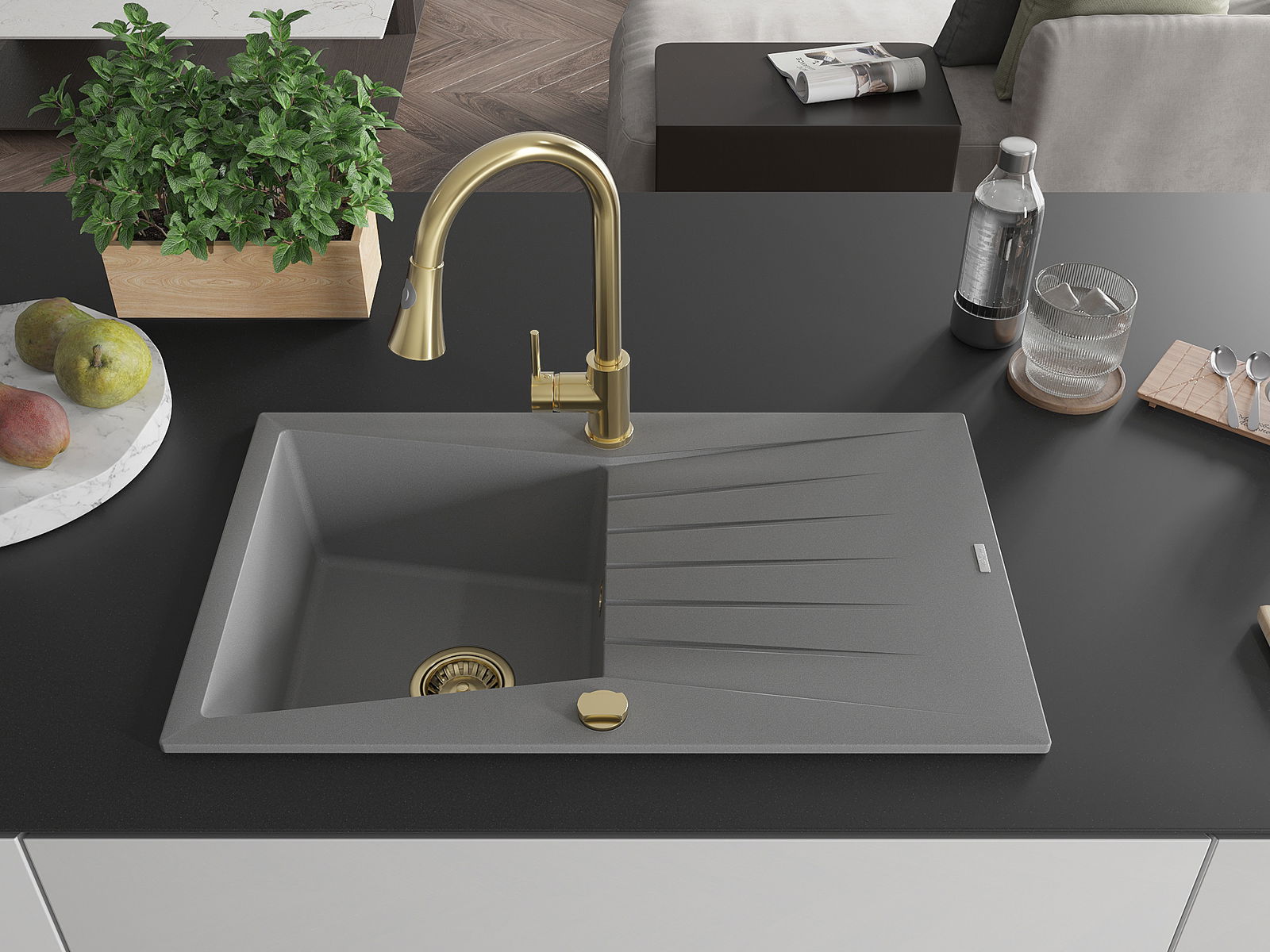 Mexen Cesar fregadero de granito de 1 cubeta con escurridor y grifo de cocina Elia, gris - 6514-71-670101-50