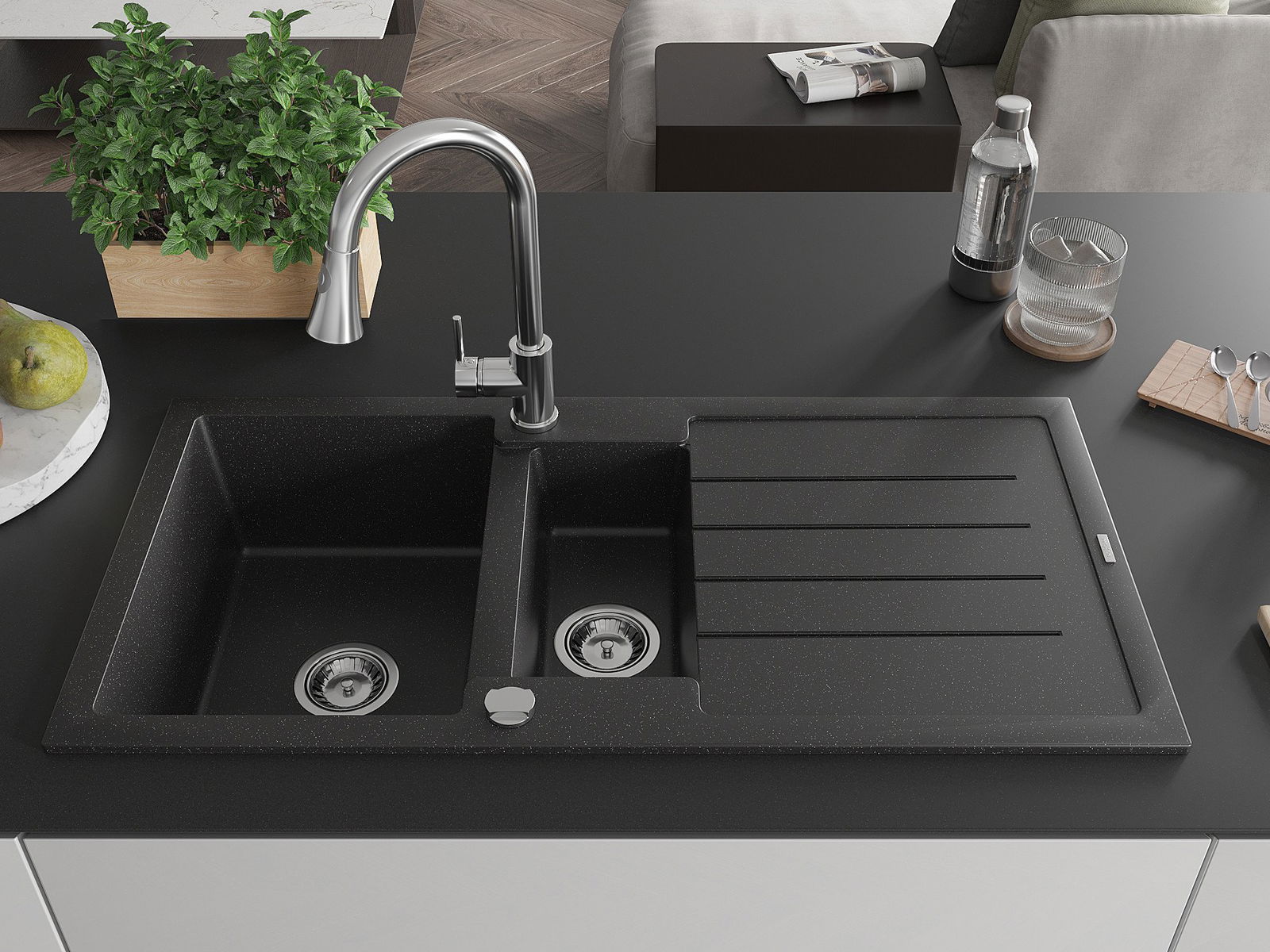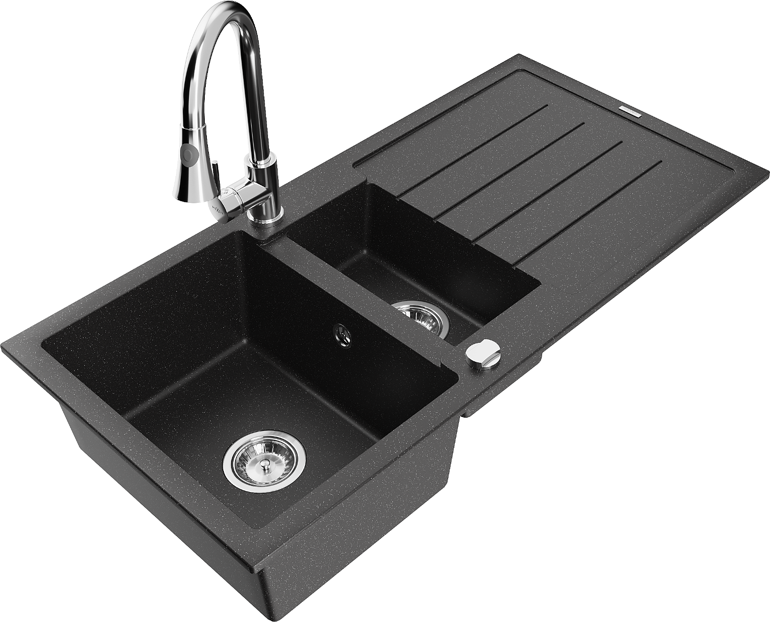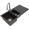 Mexen Andres fregadero de granito de 1,5 senos con escurridor y grifo de cocina Elia, negro/plateado metálico
