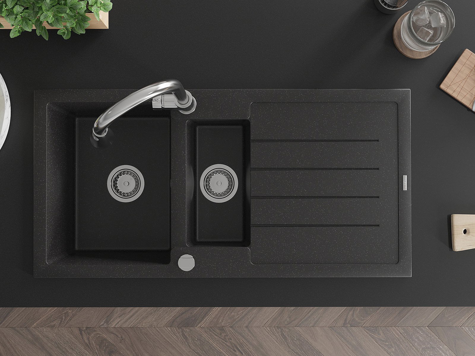 El fregadero está hecho de granito de alta calidad. Constituye un complemento elegante y, sobre todo, práctico para cualquier cocina, independientemente de su estilo. La alta calidad y durabilidad del granito aseguran un uso durante muchos años.