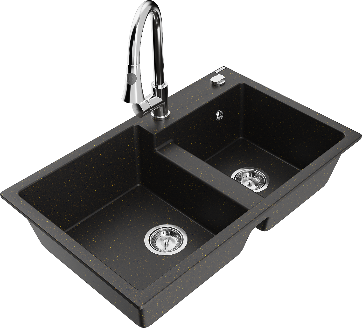 Mexen Tomas fregadero de granito de 2 compartimentos con grifo de cocina Elia, negro/dorado metálico - 6516-75-670101-00