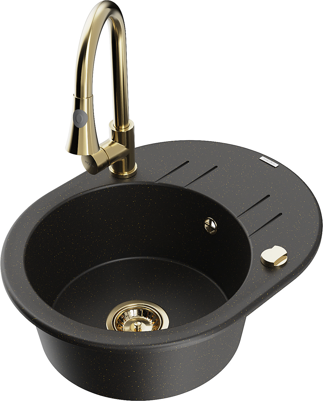 Mexen Kevin fregadero de granito de 1 cubeta con escurridor y grifo de cocina Elia, negro/dorado metalizado - 6517-75-670101-50