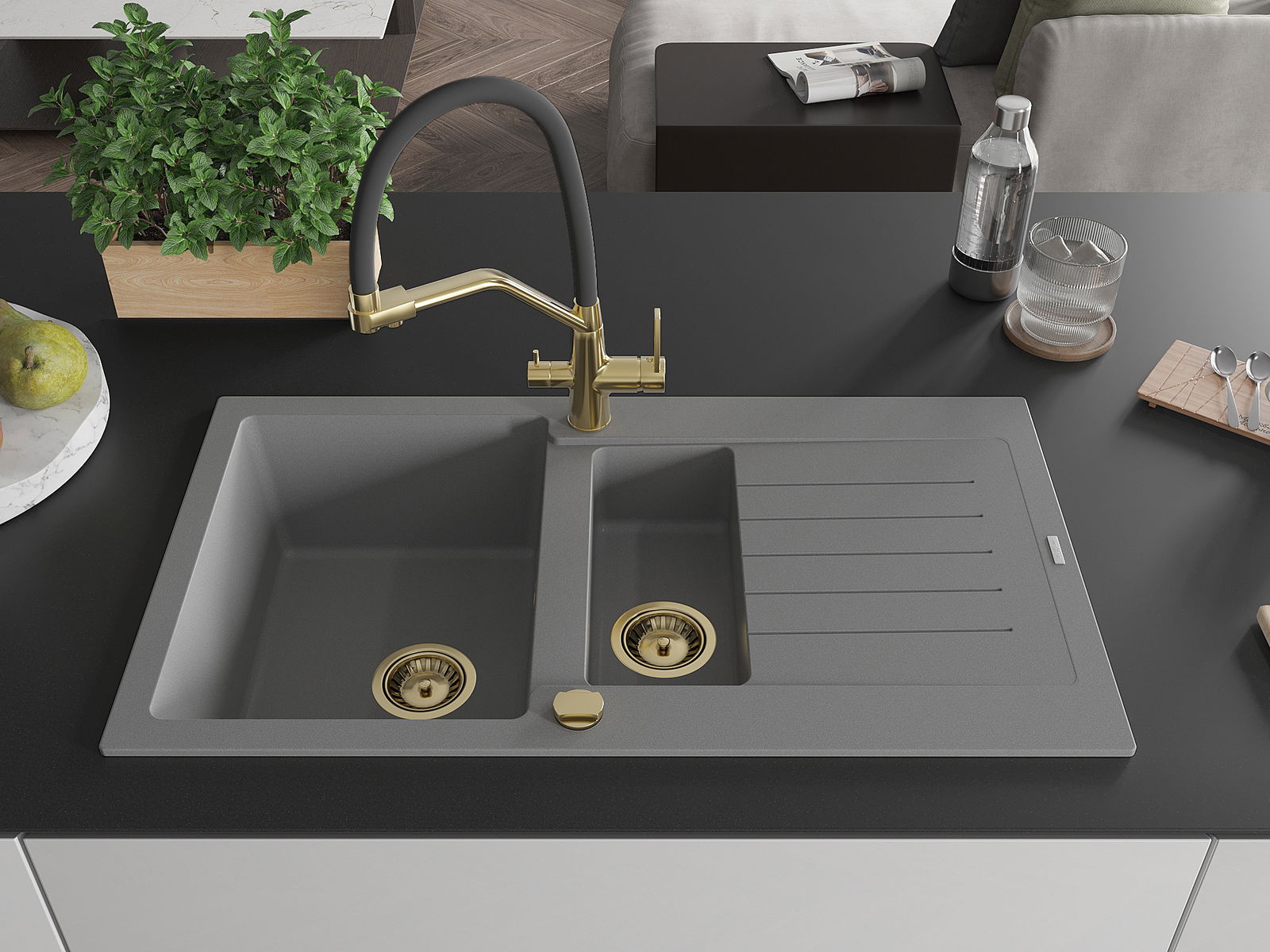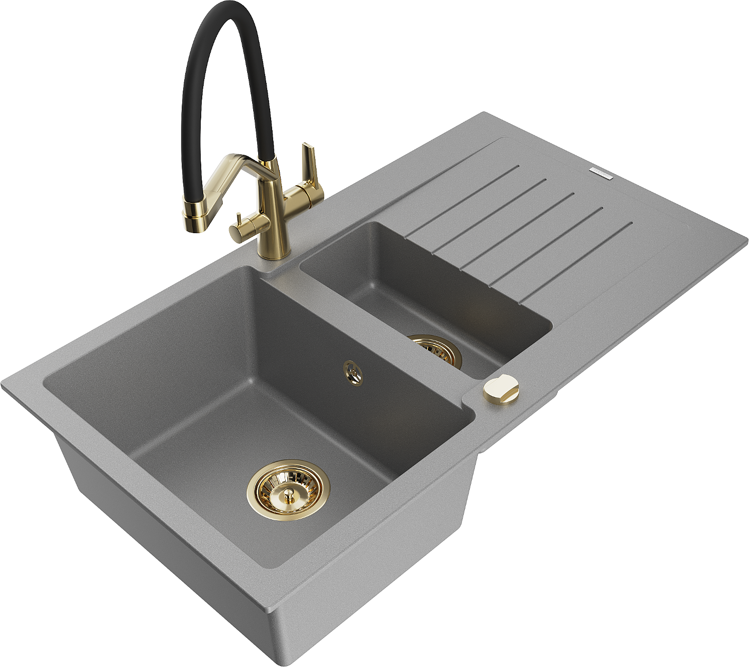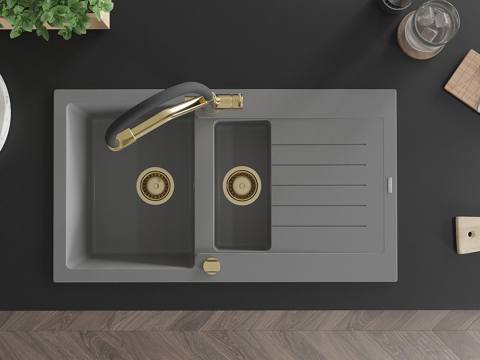 Mexen Matias fregadero de granito de 1,5 senos con escurridor y grifo de cocina Duo, gris - 6502-71-671701-57-G