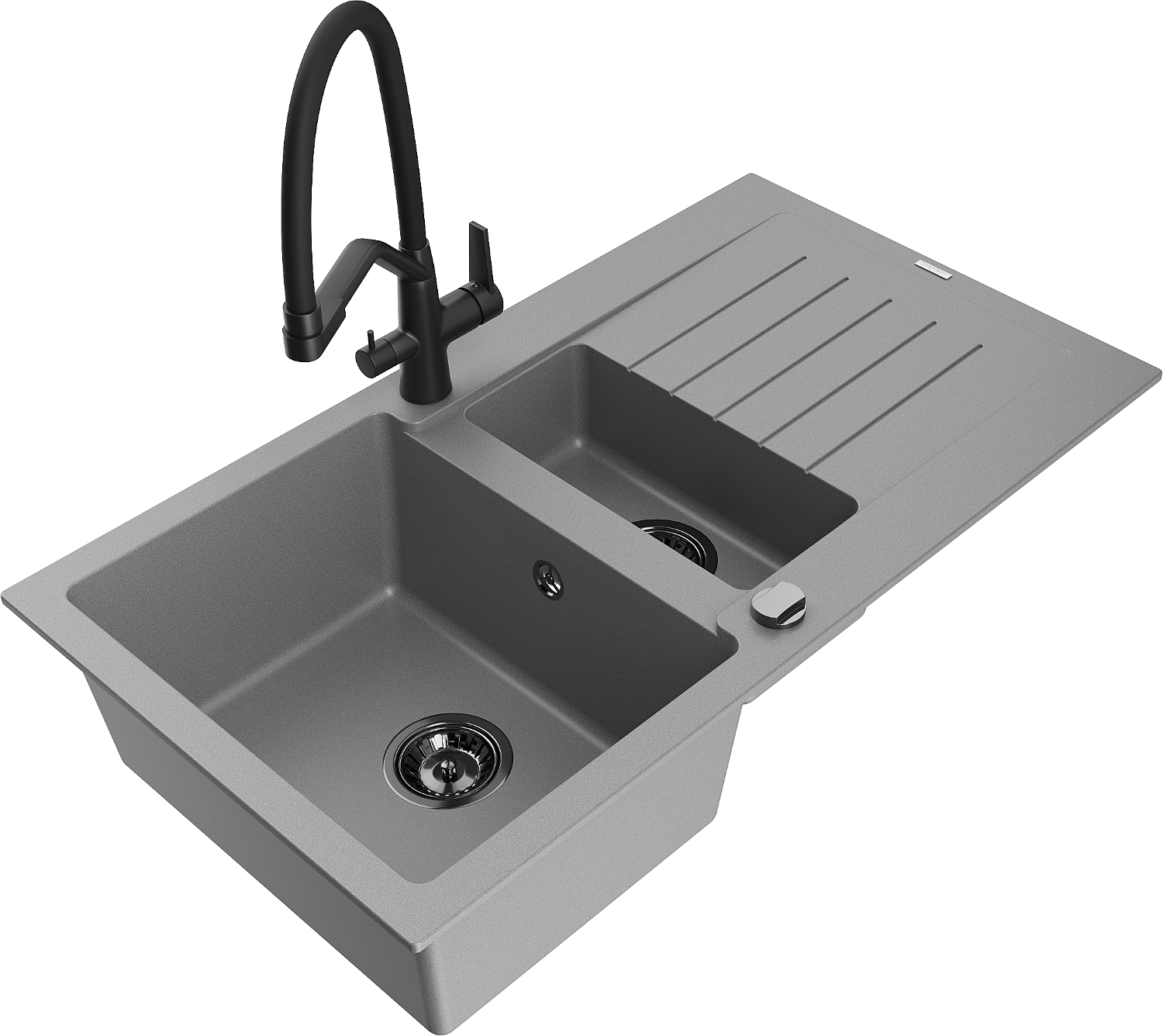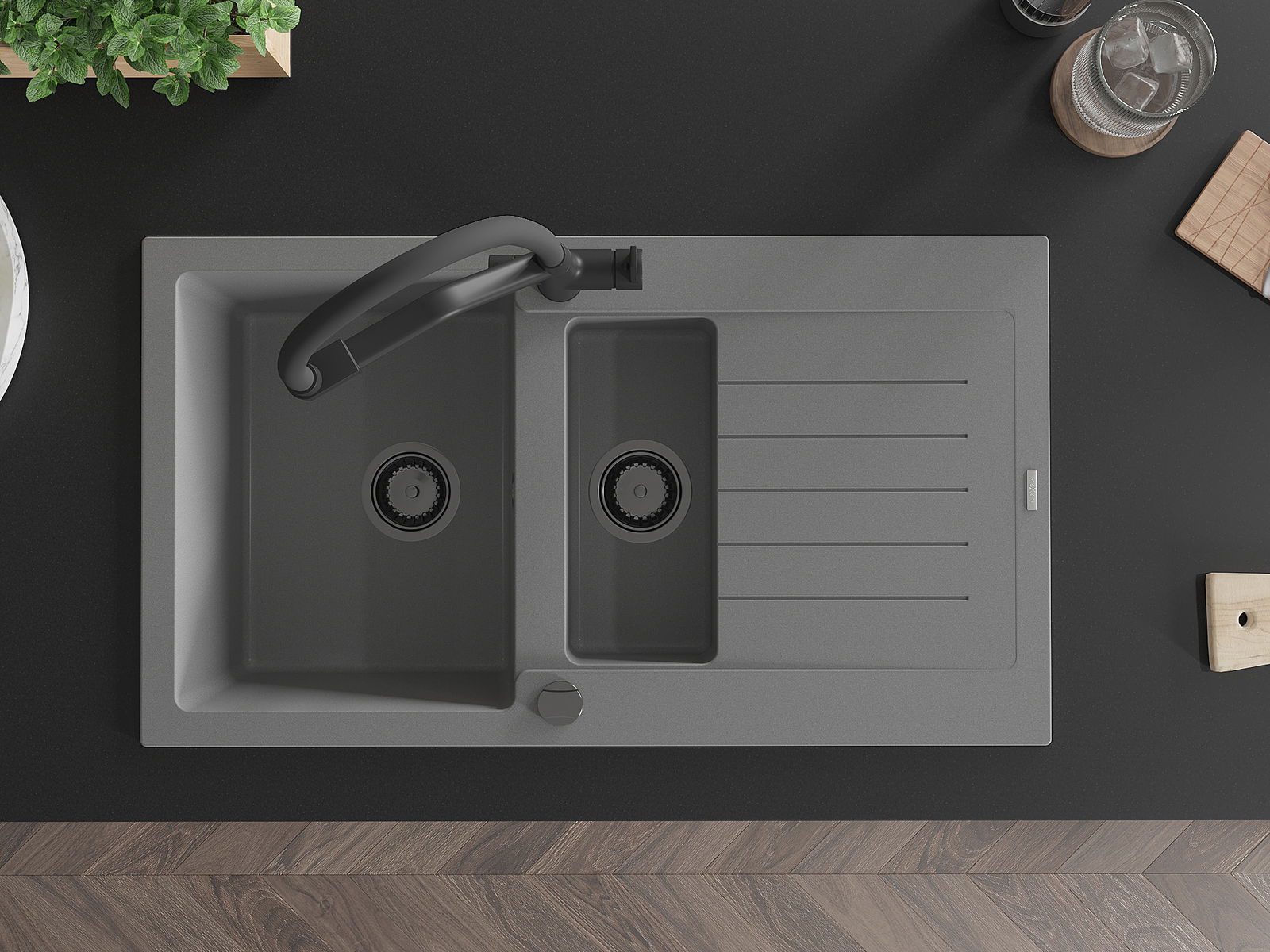 Mexen Matias fregadero de granito de 1,5 senos con escurridor y grifo de cocina Duo, gris - 6502-71-671701-70-B