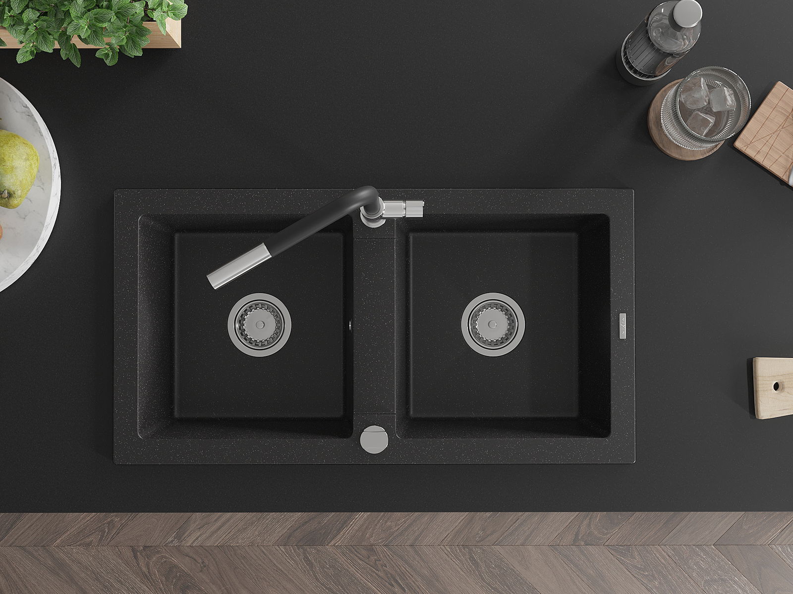 Mexen Mario fregadero de granito de 2 compartimentos con grifo de cocina Flora, negro/metálico plateado - 6504-73-670401-07