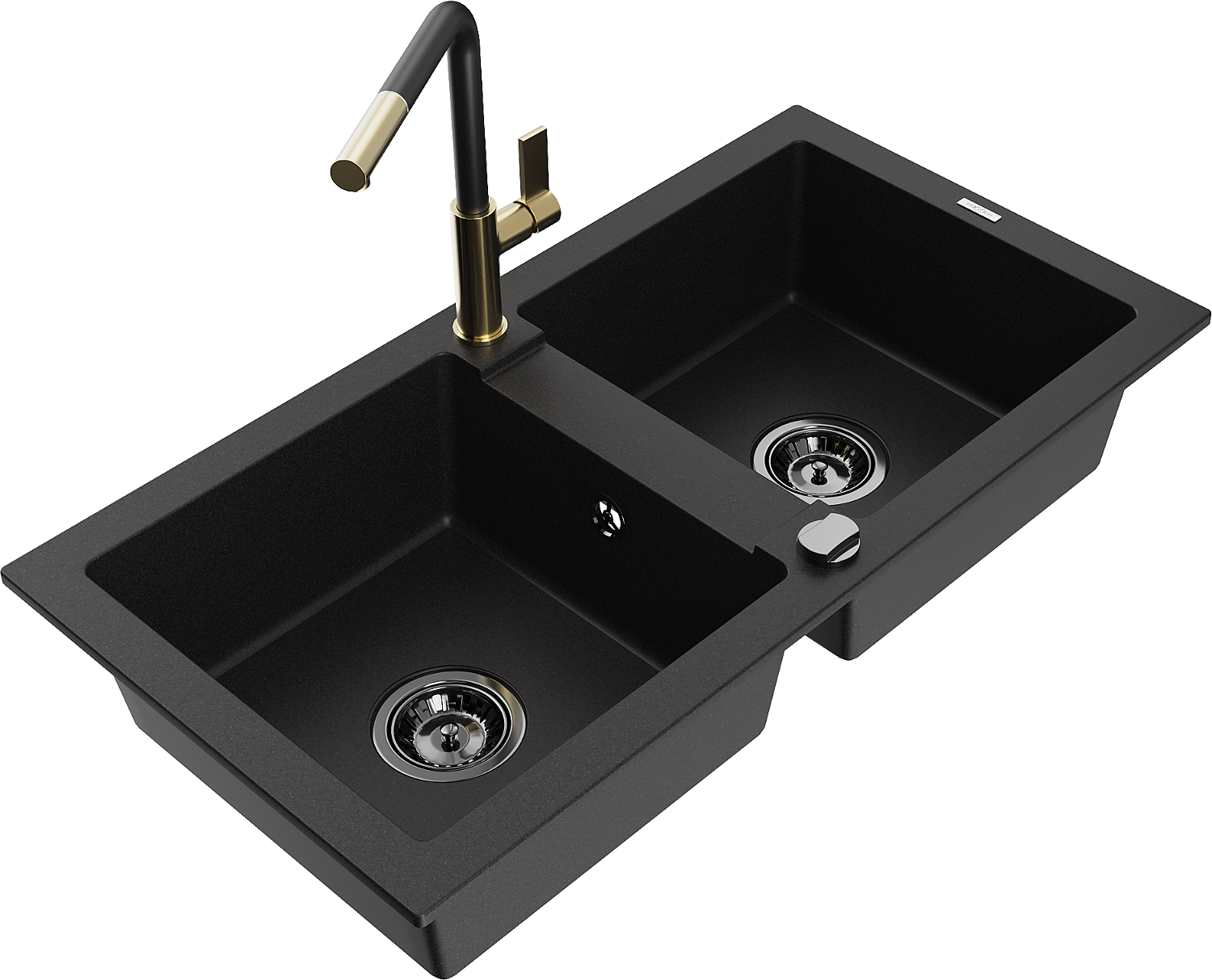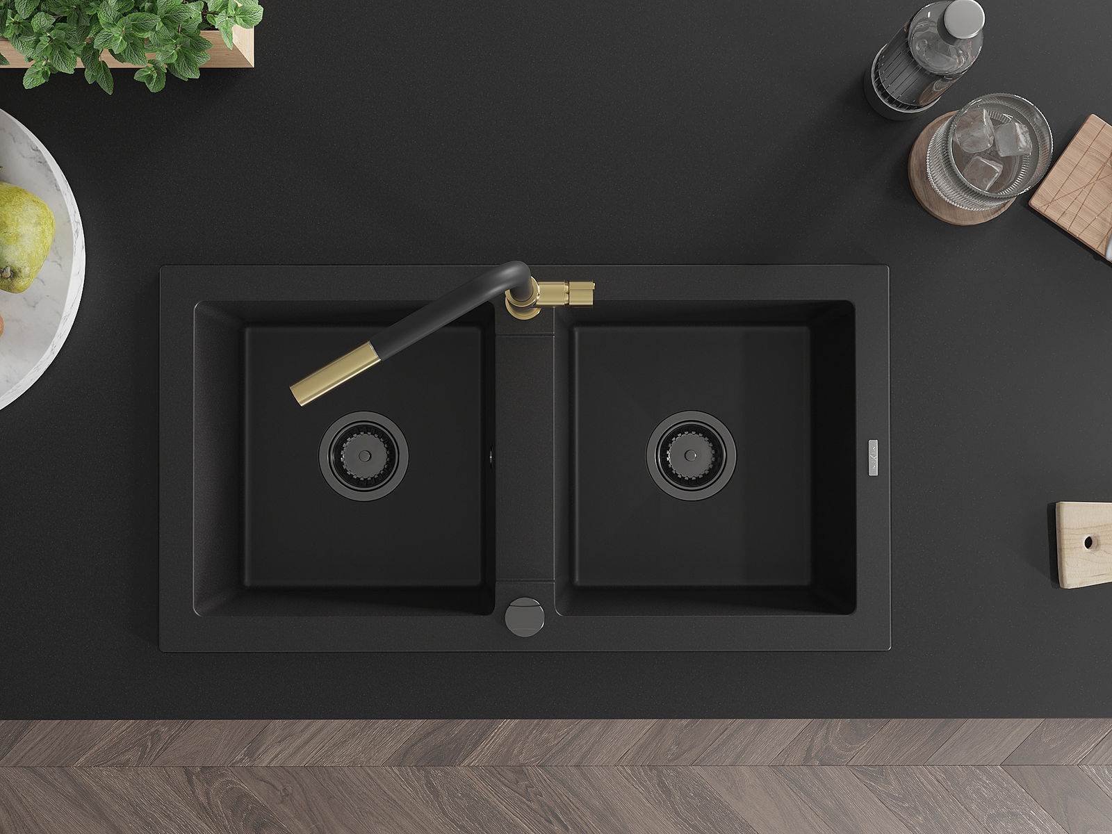 Mexen Mario fregadero de granito de 2 compartimentos con grifo de cocina Flora, negro - 6504-77-670401-57-B