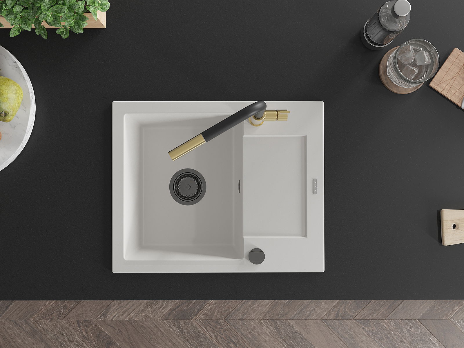 Mexen Enzo fregadero de granito 1 cubeta con escurridor y grifo de cocina Flora, blanco - 6506-20-670401-57-B