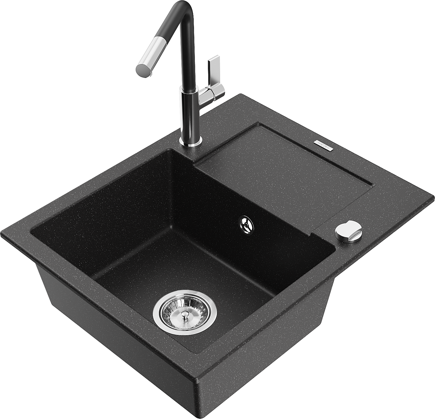 Mexen Enzo fregadero de granito de 1 cubeta con escurridor y grifo de cocina Flora, negro/plata metálico - 6506-73-670401-07