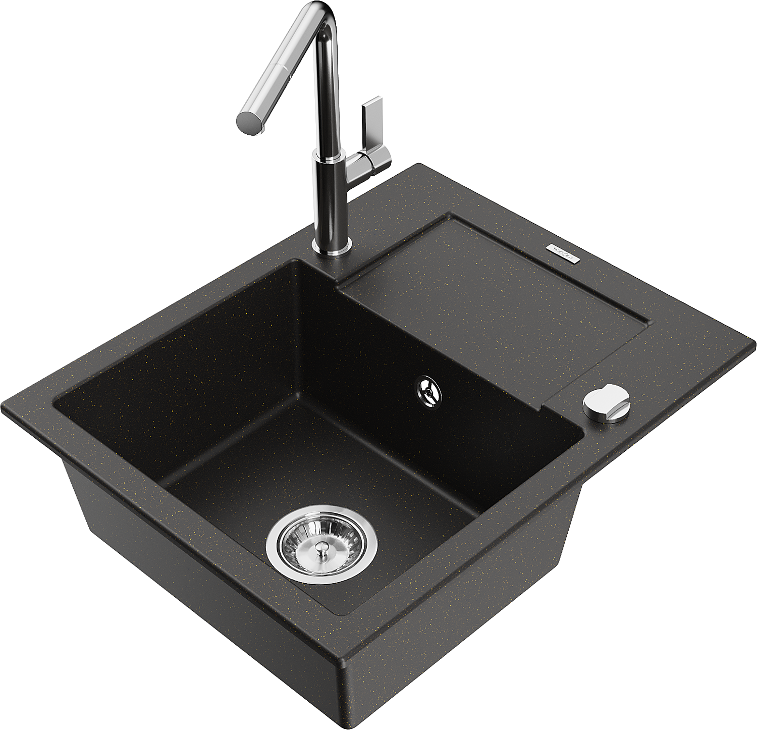 Mexen Enzo fregadero de granito de 1 seno con escurridor y grifo de cocina Flora, negro/oro metálico - 6506-75-670401-00