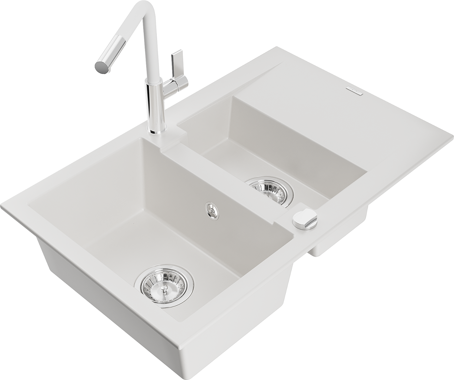 Mexen Gaspar fregadero de granito 1,5-cubetas con escurridor y grifo de cocina Flora, blanco - 6507-20-670401-02