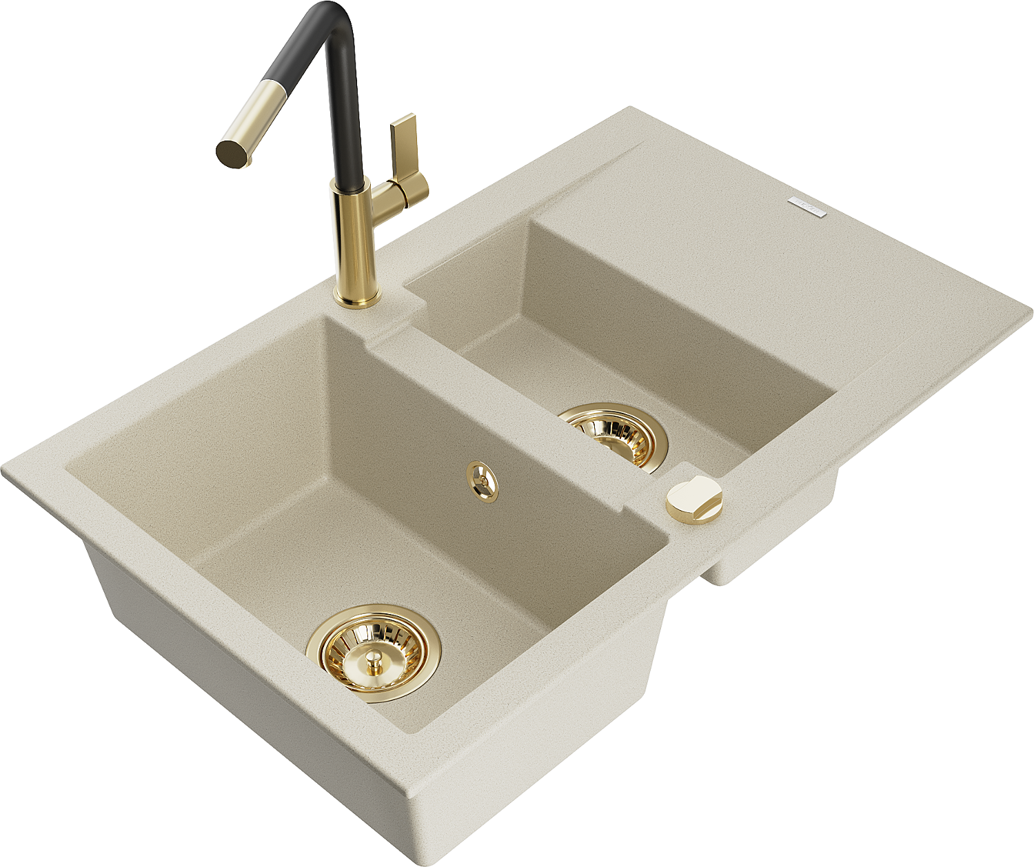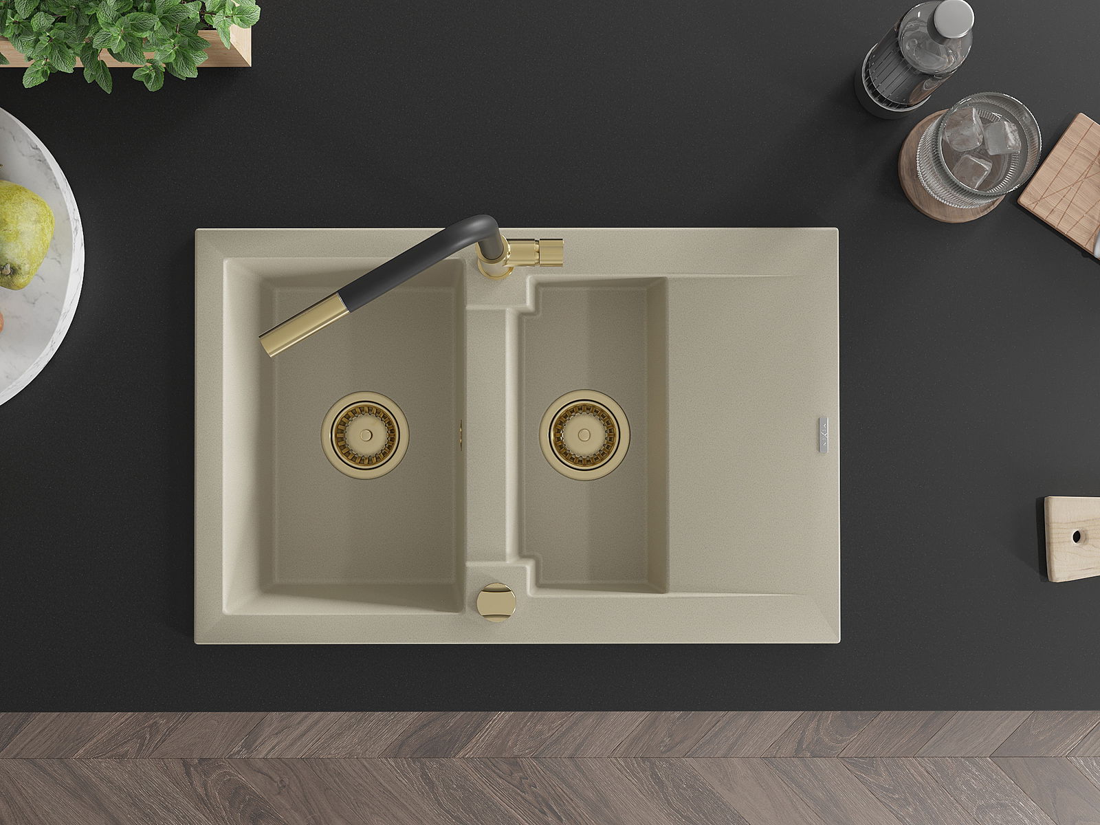 Mexen Gaspar fregadero de granito de 1,5 senos con escurridor y grifo de cocina Flora, beige - 6507-69-670401-57-G