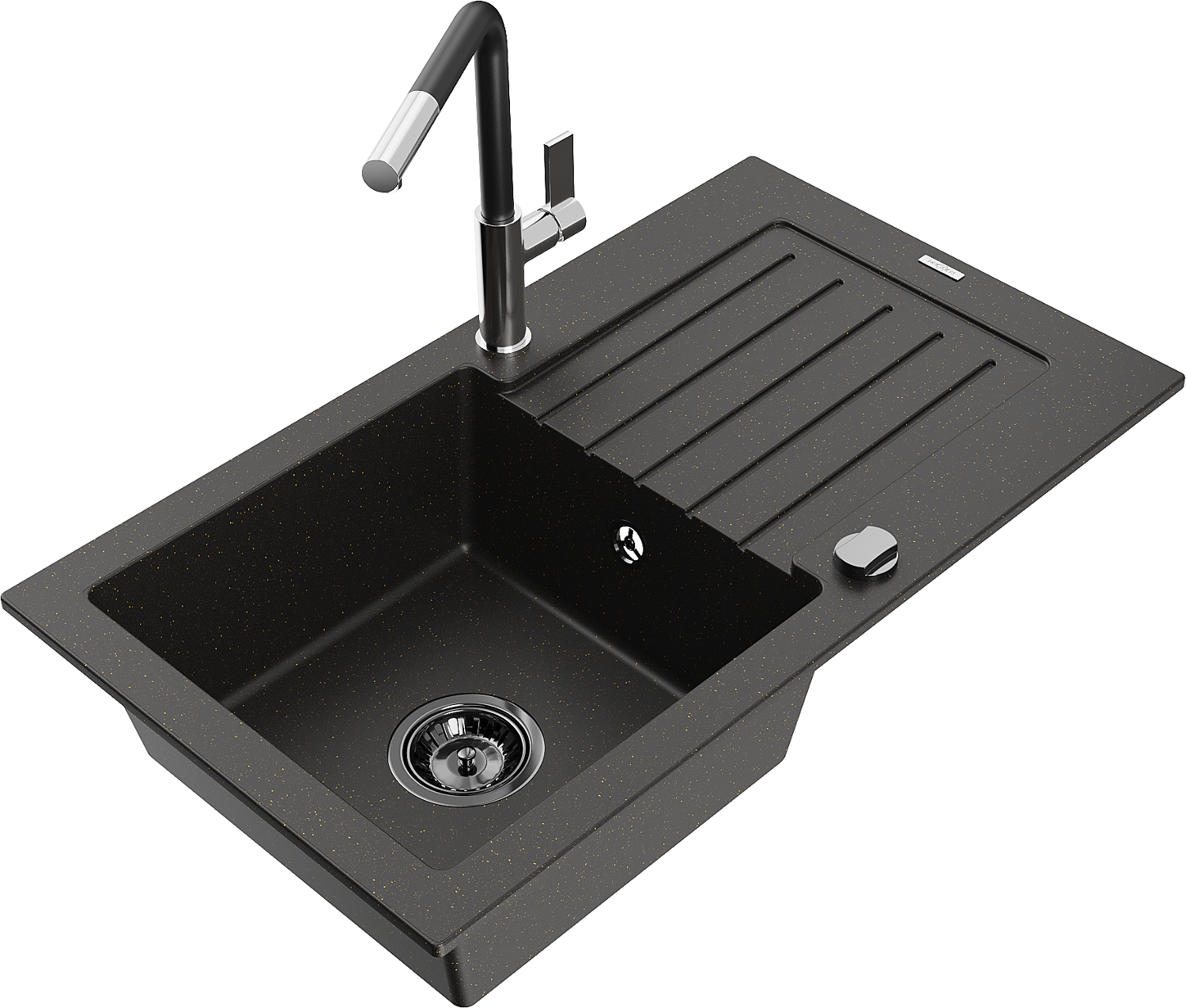 Mexen Pablo fregadero de granito de 1 cubeta con escurridor y grifo de cocina Flora, negro/dorado metálico