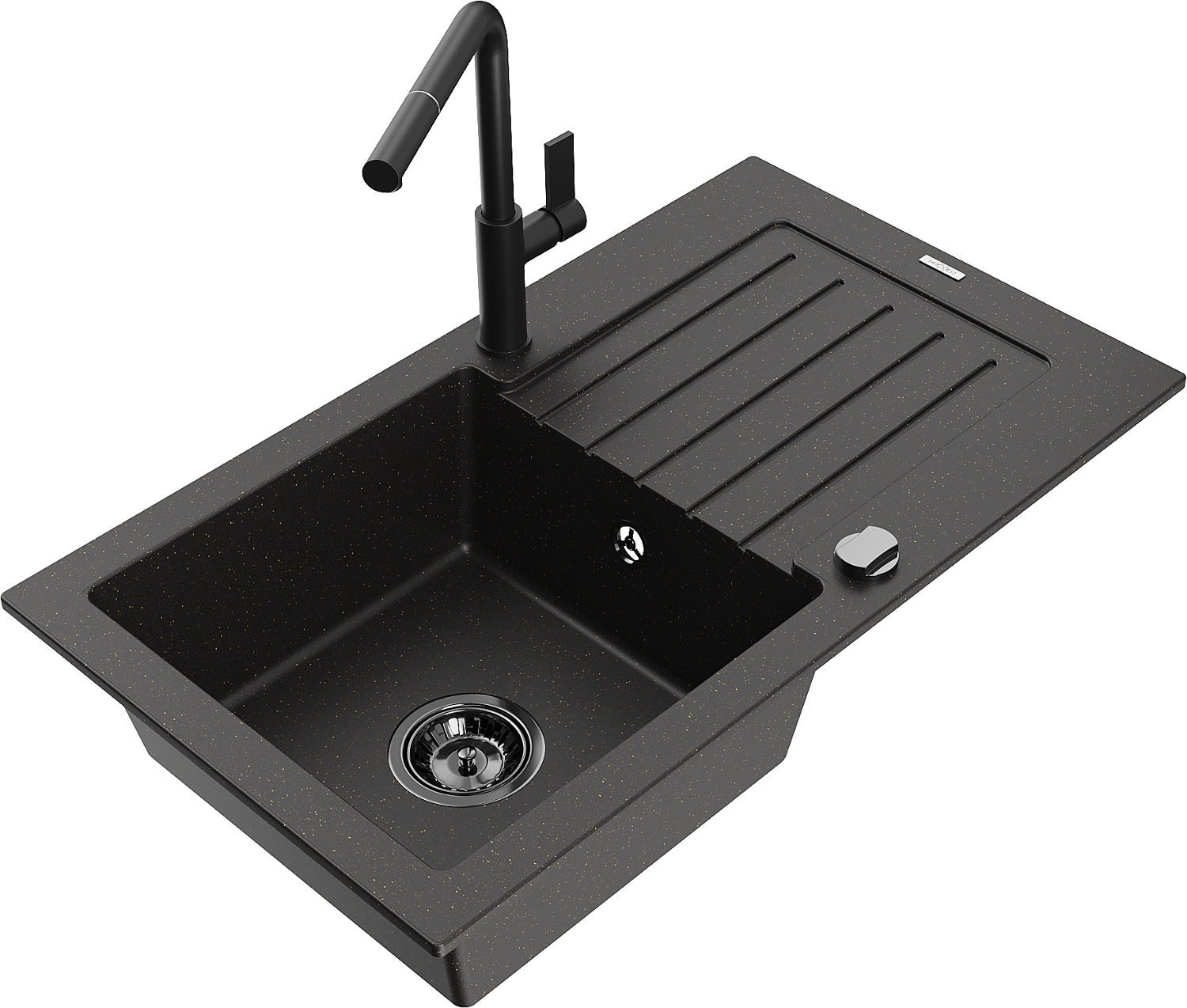 Mexen Pablo fregadero de granito de 1 cubeta con escurridor y grifo de cocina Flora, negro/oro metálico - 6510-75-670401-70-B
