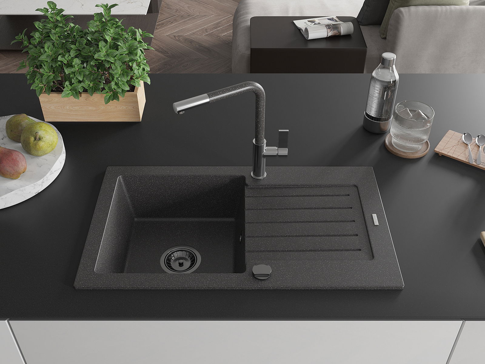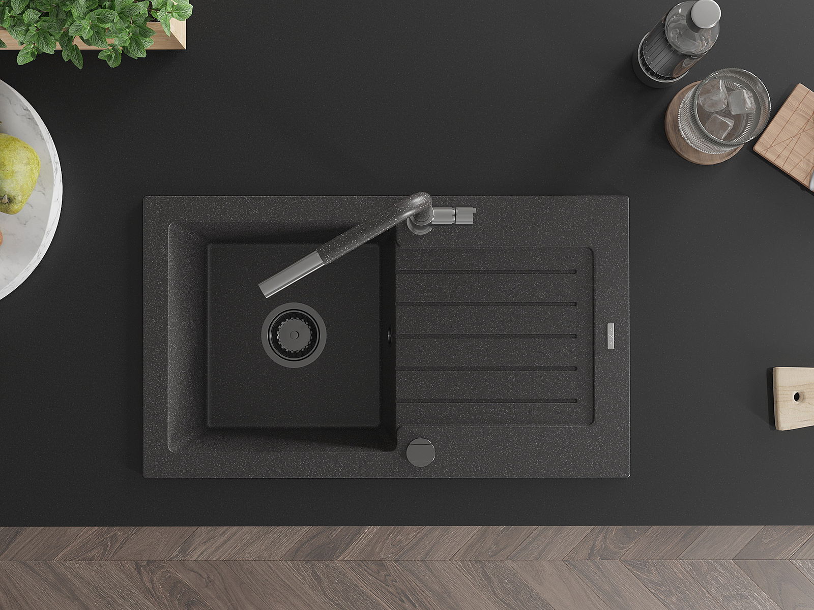 El fregadero está hecho de granito de alta calidad. Es un complemento elegante y, sobre todo, práctico para cualquier cocina, independientemente de su estilo. La alta calidad y durabilidad del granito aseguran un uso prolongado durante años.