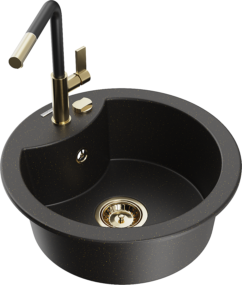 Mexen Diego fregadero de granito de 1 cubeta con grifo de cocina Flora, negro/dorado metálico - 6512-75-670401-57-G
