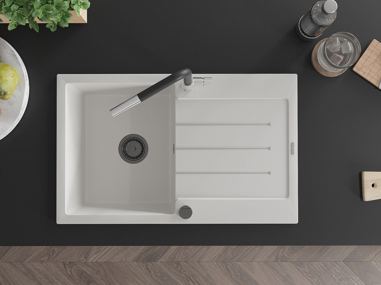 Mexen Bruno fregadero de granito de 1 seno con escurridor y grifo de cocina Flora, blanco - 6513-20-670401-07-B