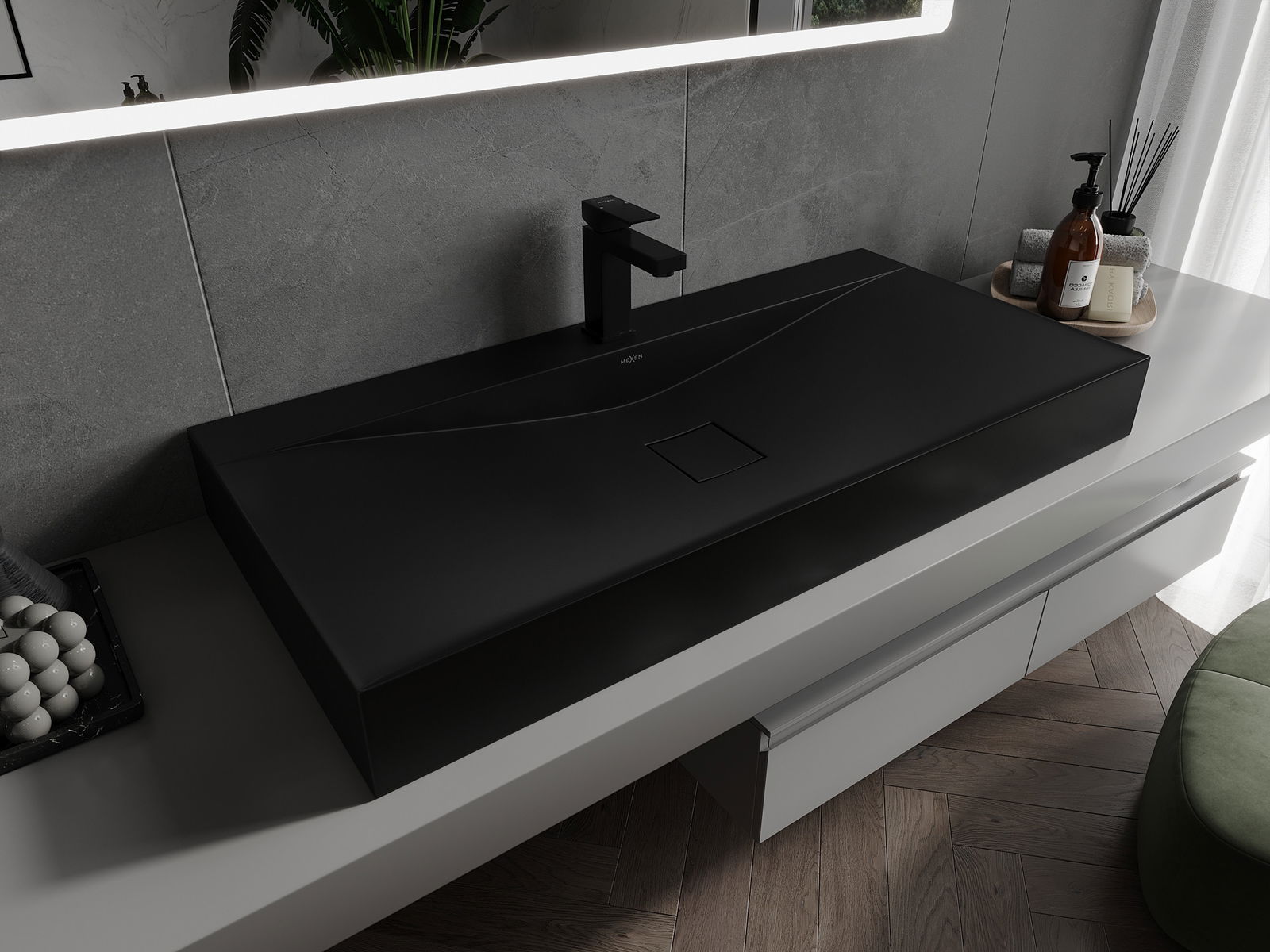 El lavabo tiene un agujero en el que podemos instalar el grifo. Esto permite ahorrar un valioso espacio en el baño y resaltar su estética. Esta solución también facilita el mantenimiento de la limpieza alrededor del lavabo.
