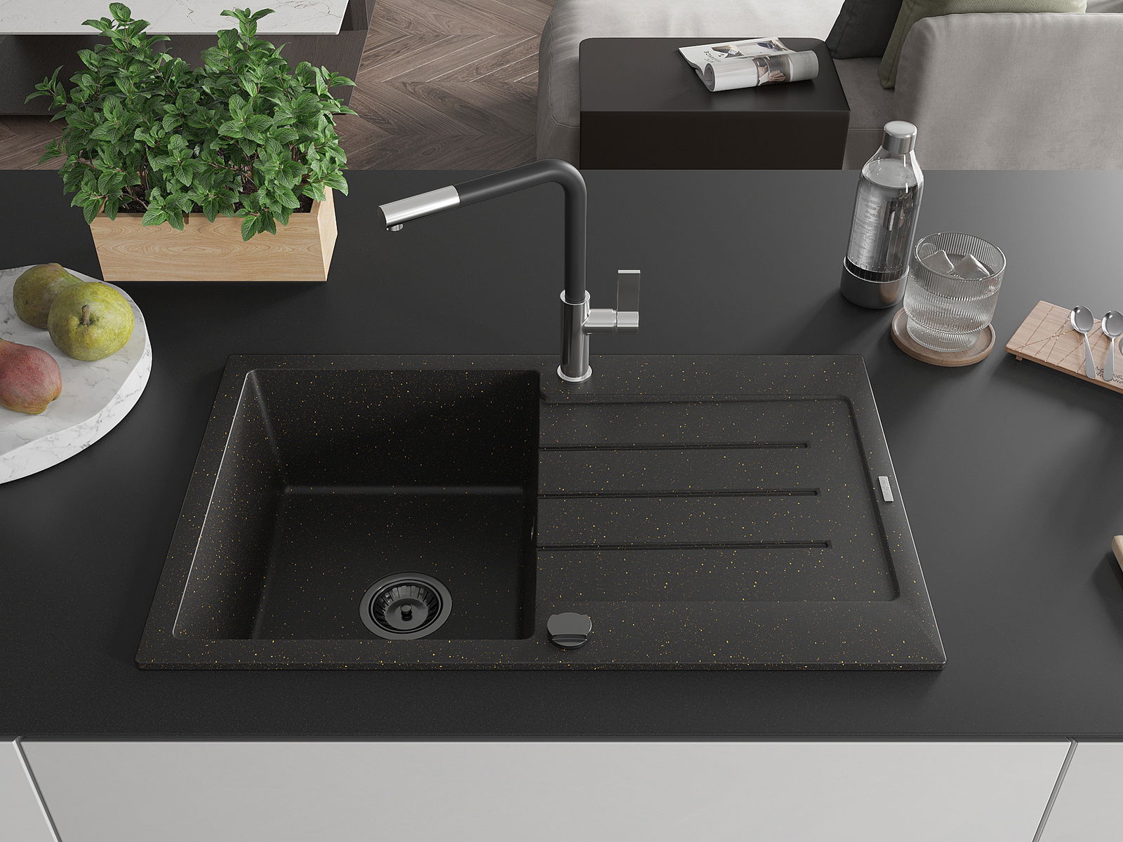 El fregadero está hecho de granito de alta calidad. Constituye un complemento elegante y, sobre todo, práctico para cualquier cocina, independientemente de su estilo. La alta calidad y durabilidad del granito aseguran un uso durante muchos años.