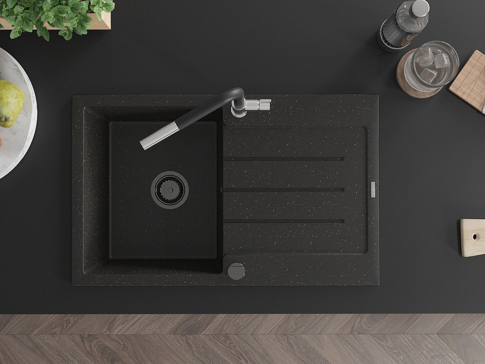 Mexen Bruno fregadero de granito de un seno con escurridor y grifo de cocina Flora, negro/dorado metálico - 6513-75-670401-07-B
