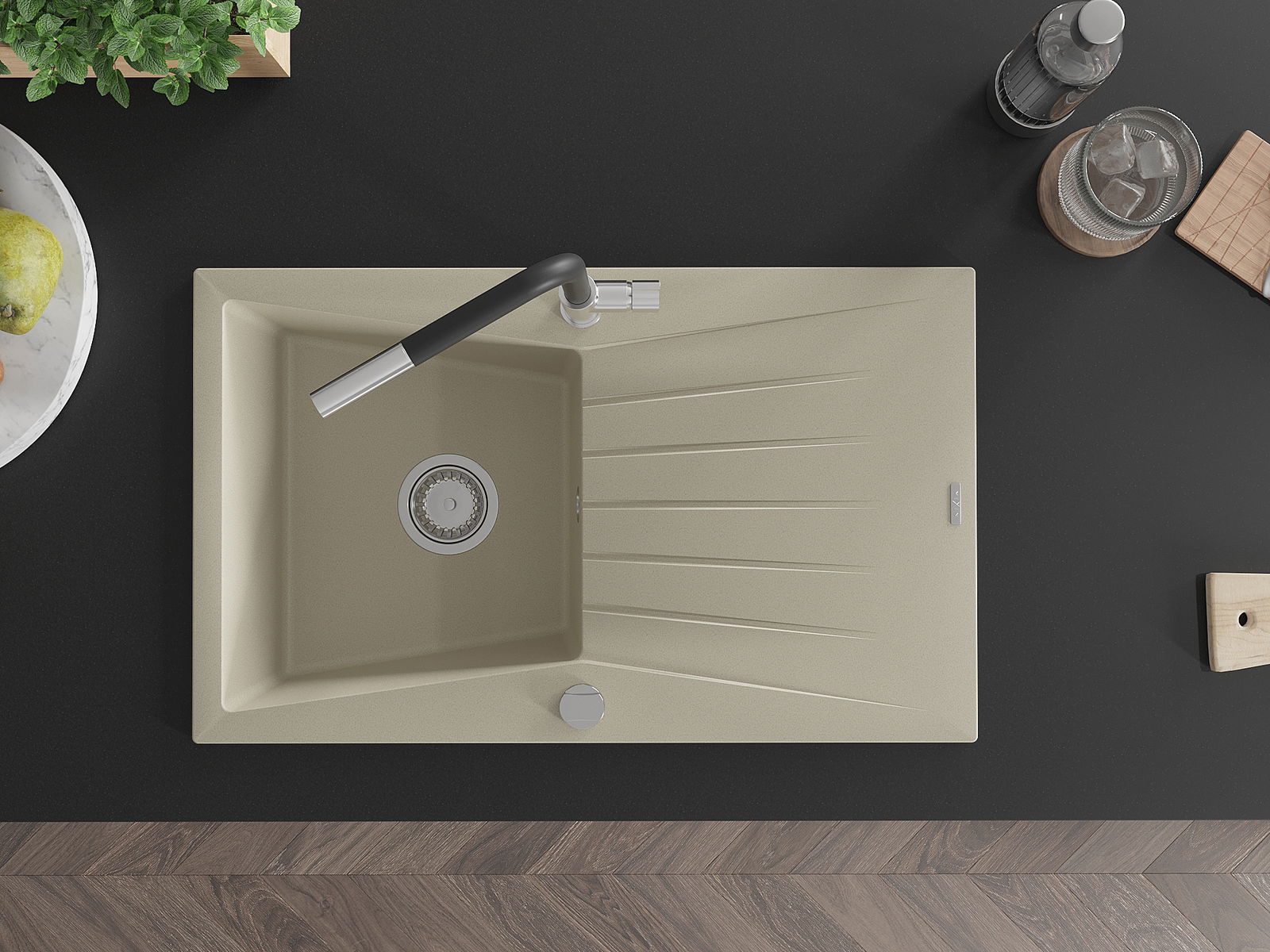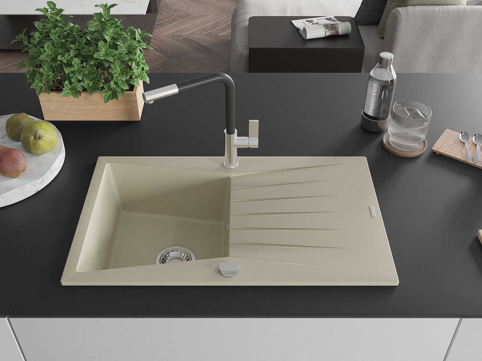 El fregadero está hecho de granito de alta calidad. Constituye un complemento elegante y, sobre todo, práctico para cualquier cocina, independientemente de su estilo. La alta calidad y durabilidad del granito aseguran un uso durante muchos años.