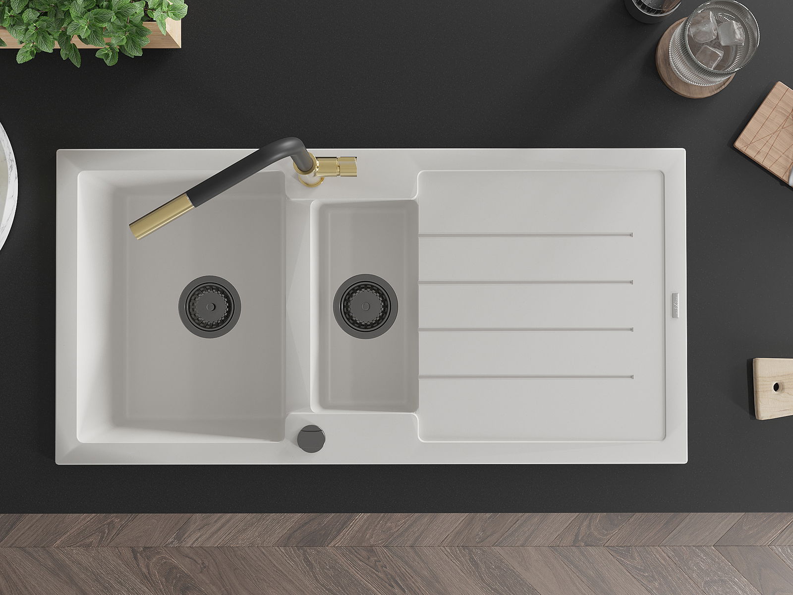 Mexen Andres fregadero de granito de 1,5 compartimentos con escurridor y grifo de cocina Flora, blanco - 6515-20-670401-57-B