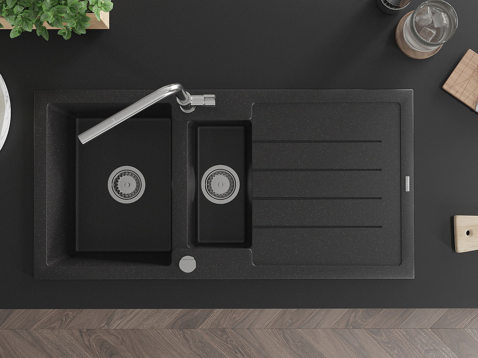 El fregadero está hecho de granito de alta calidad. Constituye un complemento elegante y, sobre todo, práctico para cualquier cocina, independientemente de su estilo. La alta calidad y durabilidad del granito aseguran un uso durante muchos años.