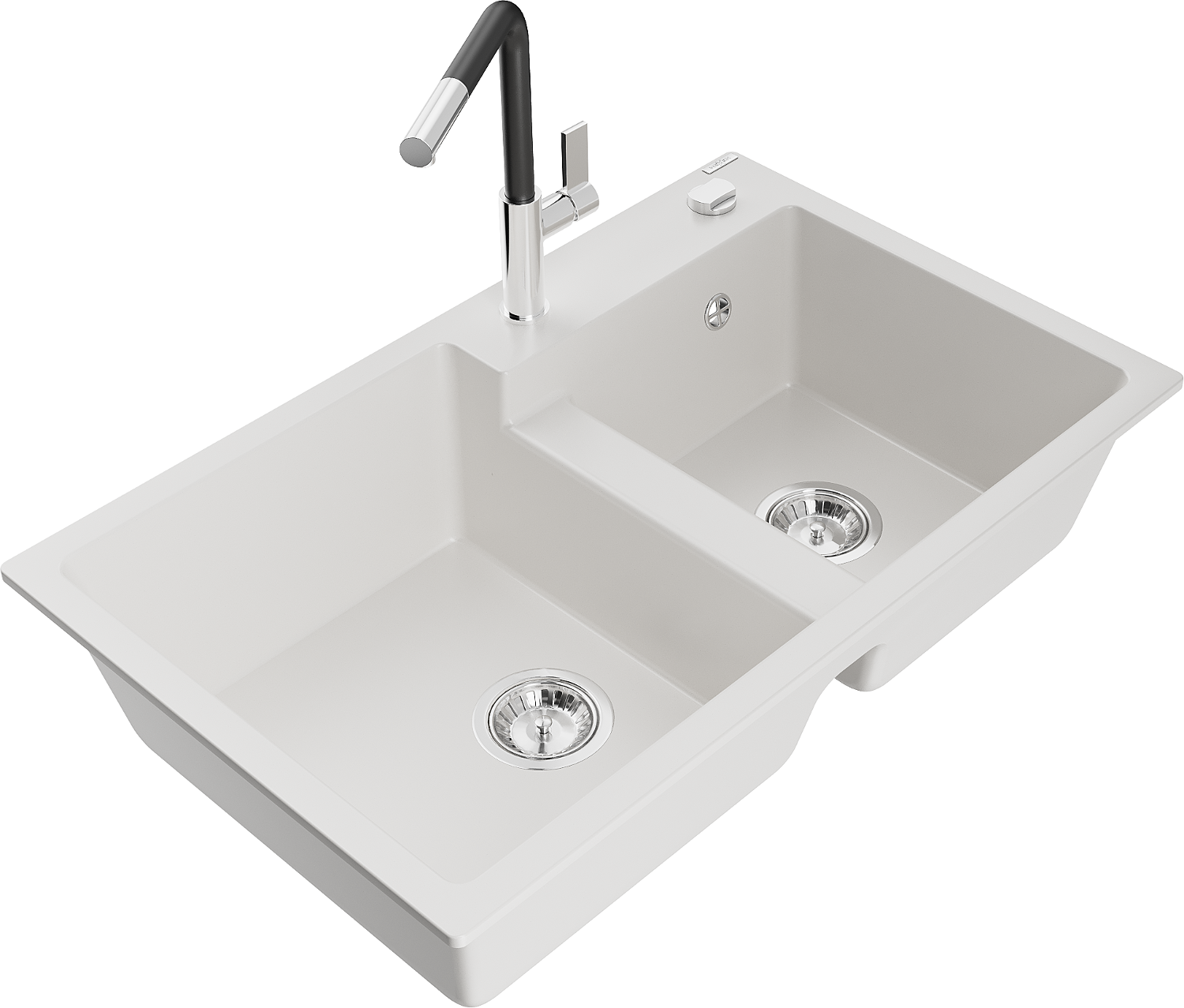 Mexen Tomas fregadero de granito de 2 senos con grifo de cocina Flora, blanco - 6516-20-670401-07