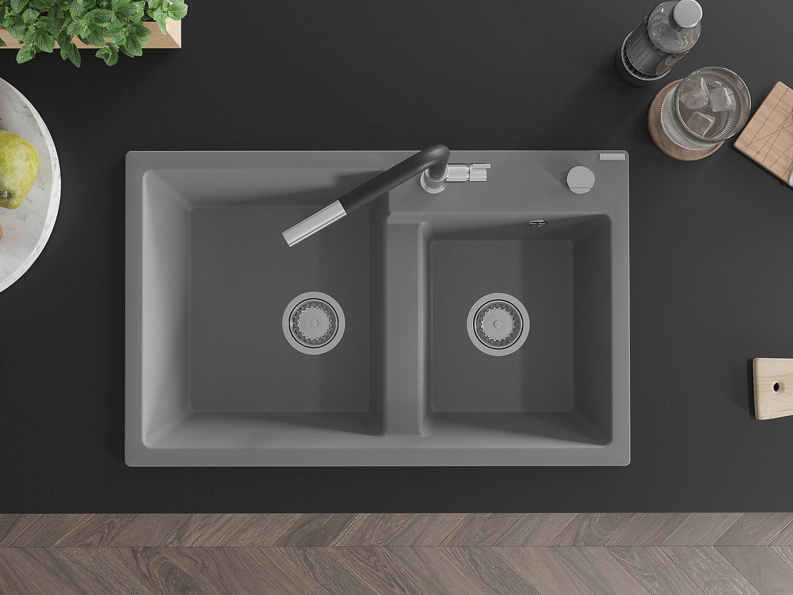 Mexen Tomas fregadero de granito de 2 compartimentos con grifo de cocina Flora, gris - 6516-71-670401-07