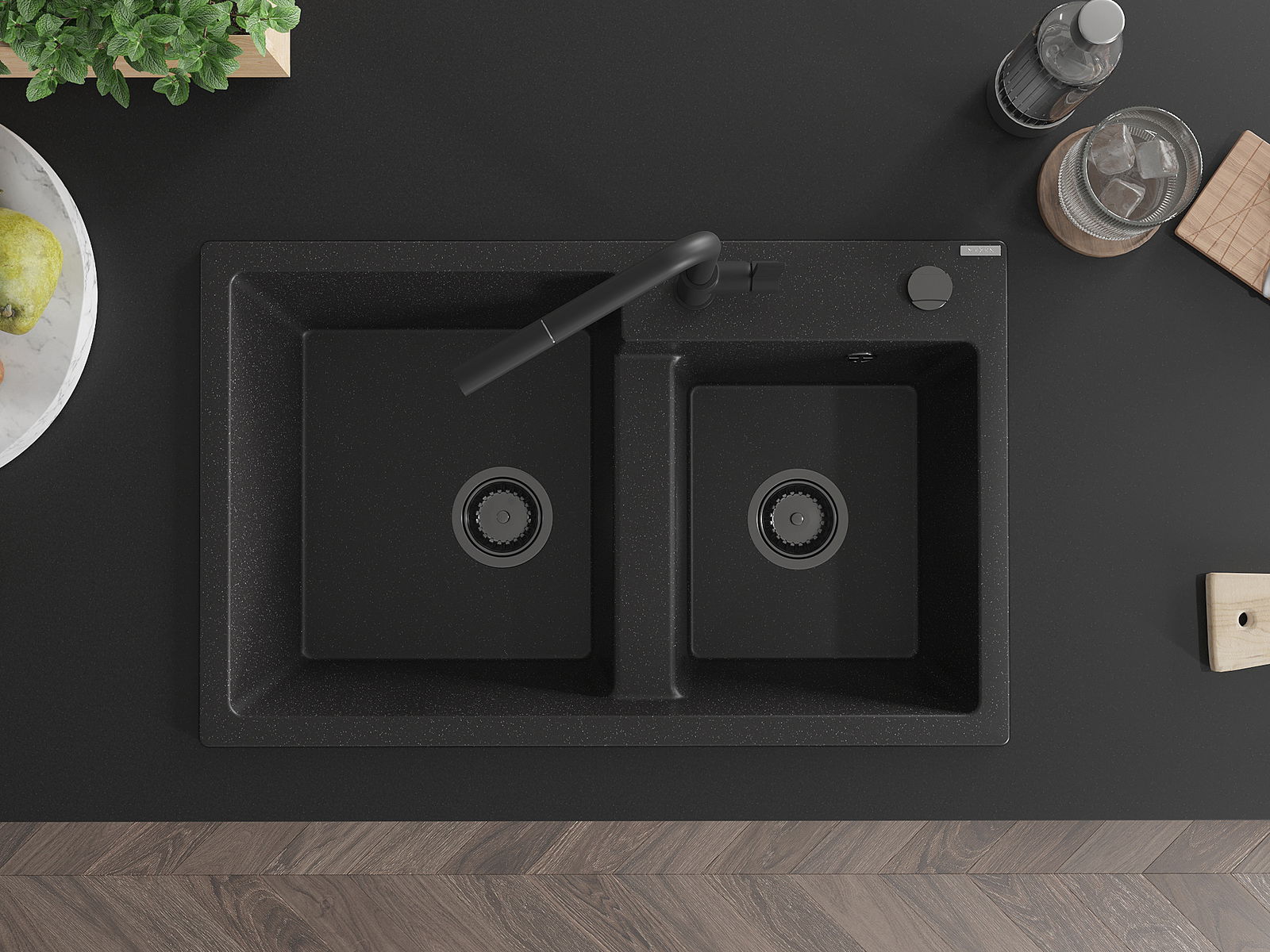 Mexen Tomas fregadero de granito de 2 cámaras con grifo de cocina Flora, negro/plateado metálico - 6516-73-670401-70-B