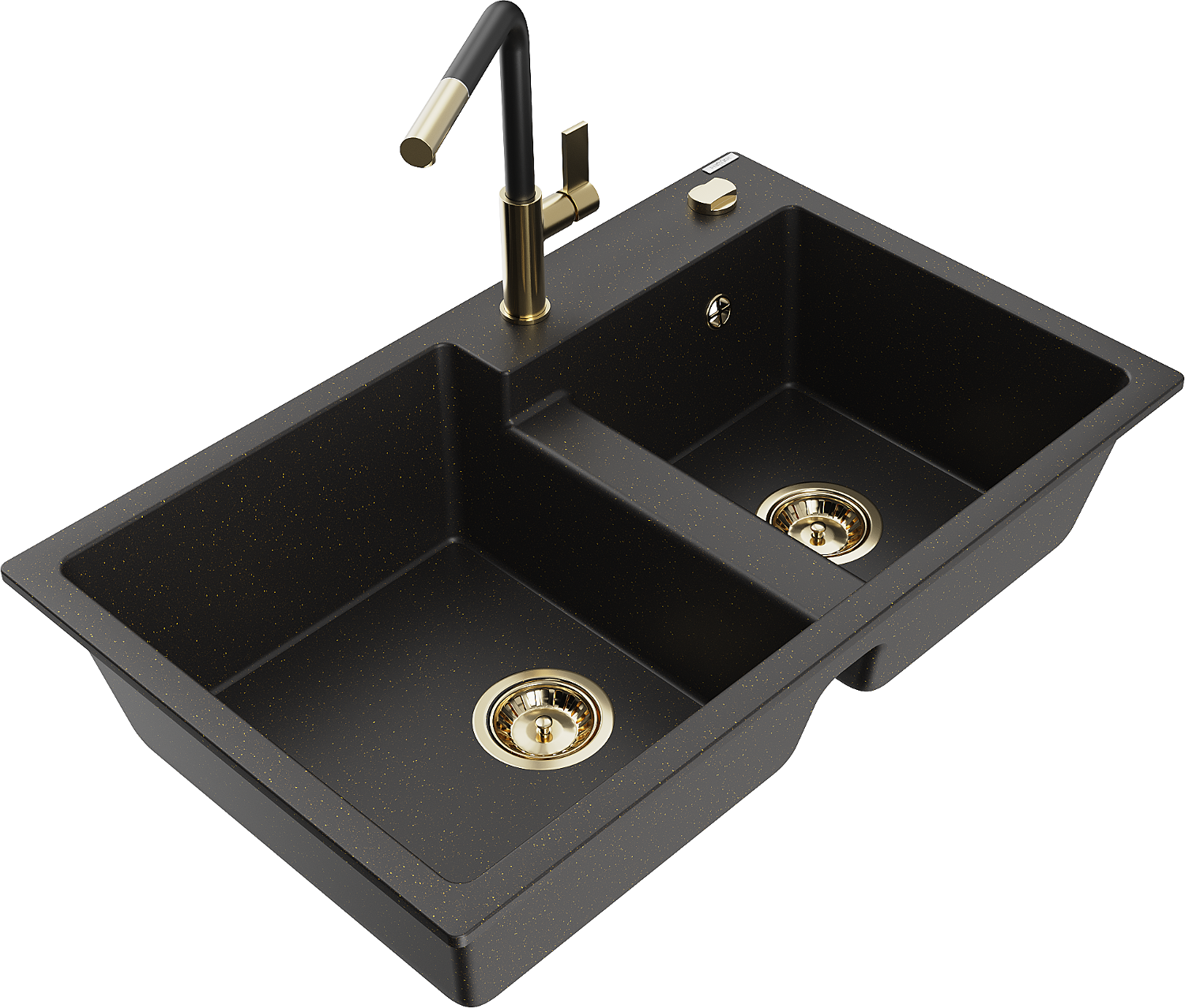 Mexen Tomas fregadero de granito de 2 compartimientos con grifo de cocina Flora, negro/dorado metálico - 6516-75-670401-57-G