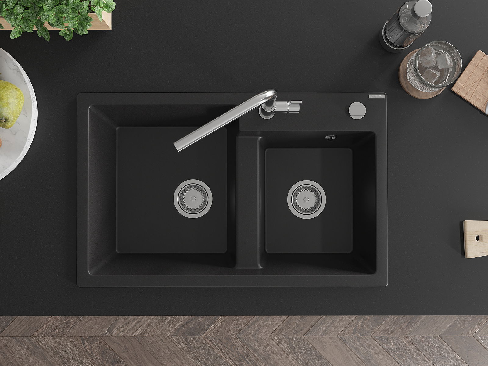 Mexen Tomas fregadero de granito de 2 compartimentos con grifo de cocina Flora, negro - 6516-77-670401-00