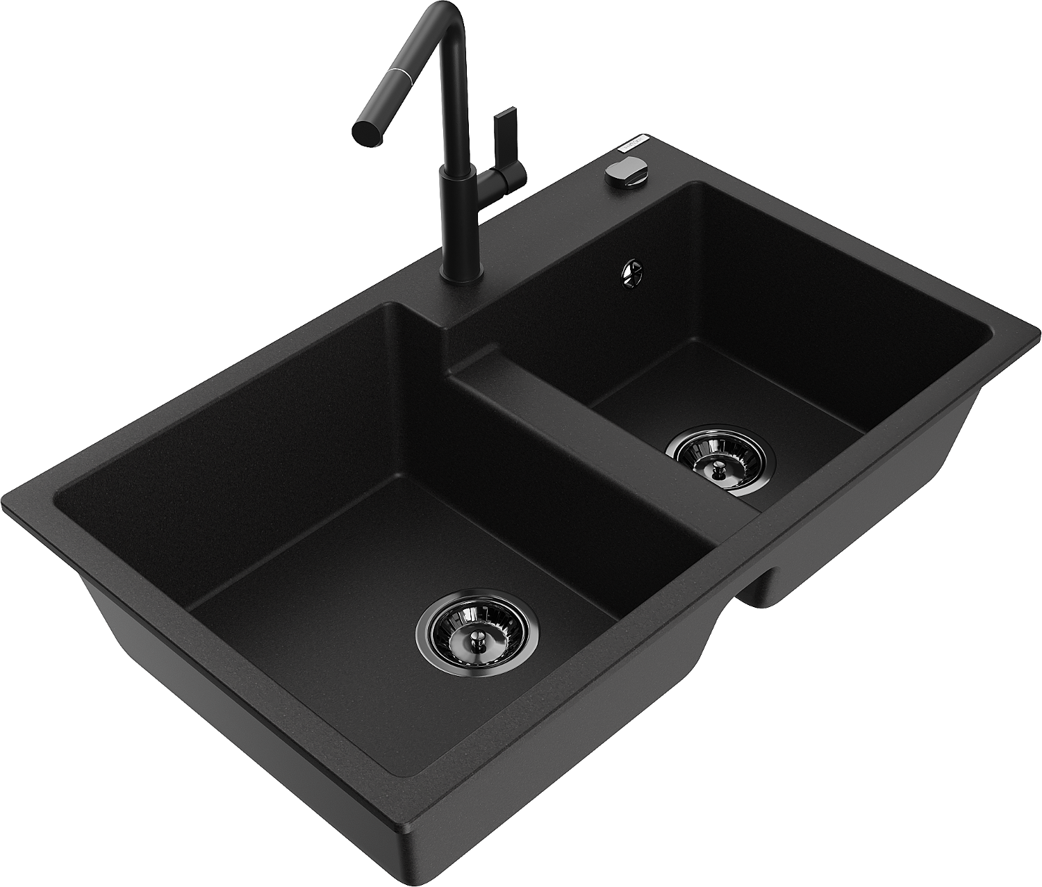 Mexen Tomas fregadero de granito de 2 senos con grifo de cocina Flora, negro - 6516-77-670401-70-B