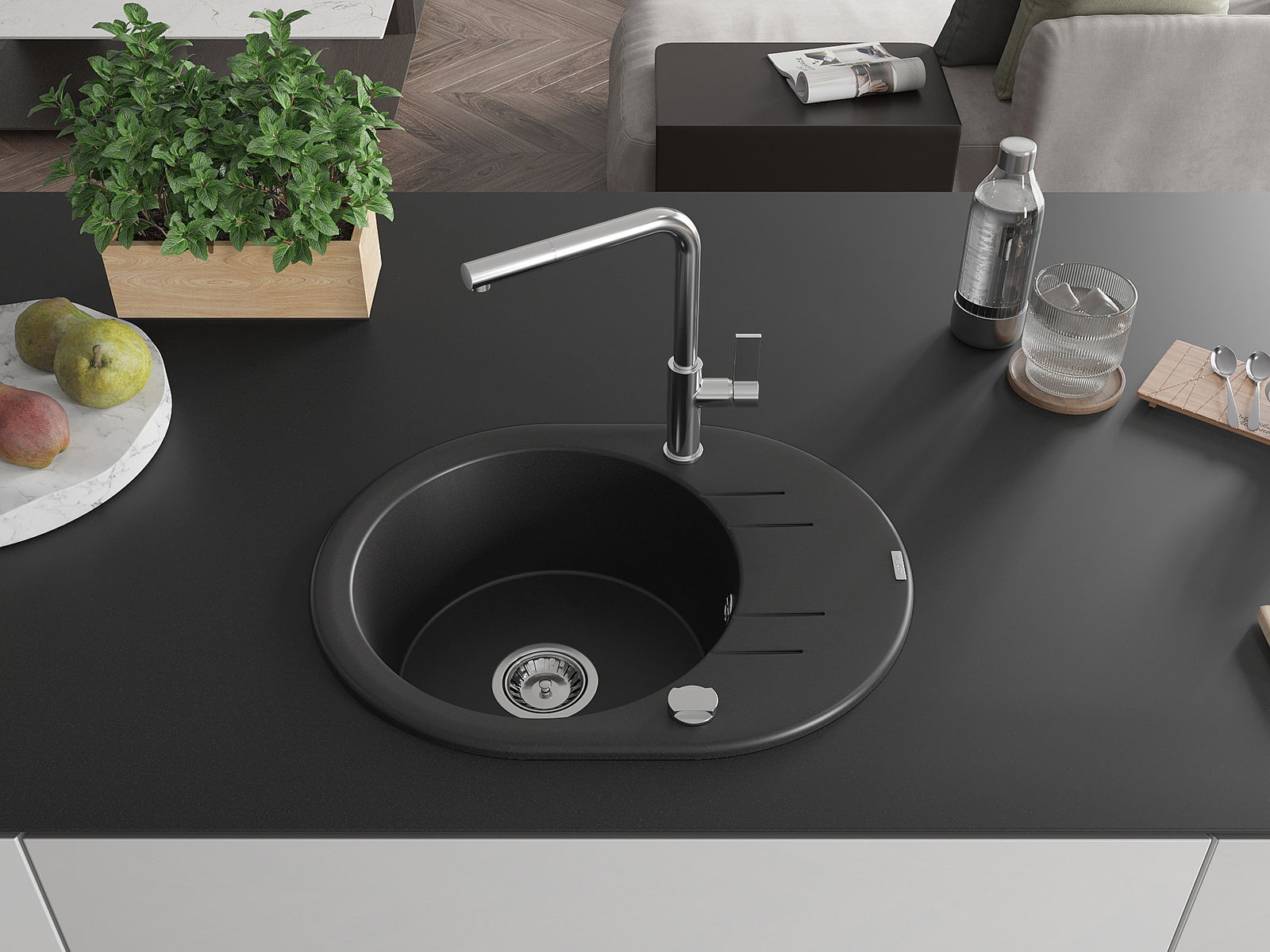 El fregadero está hecho de granito de alta calidad. Constituye un complemento elegante y, sobre todo, práctico para cualquier cocina, independientemente de su estilo. La alta calidad y durabilidad del granito aseguran un uso durante muchos años.