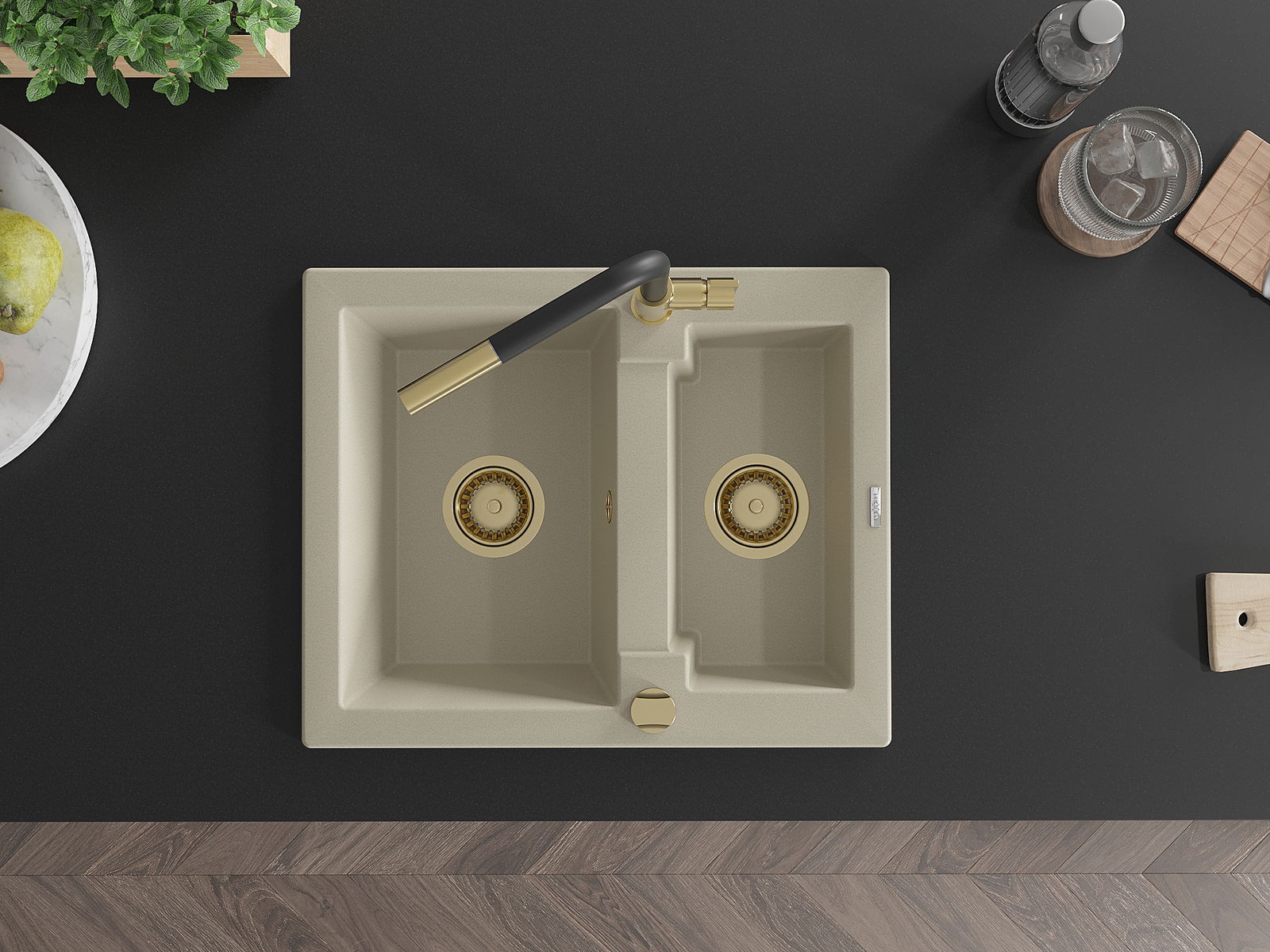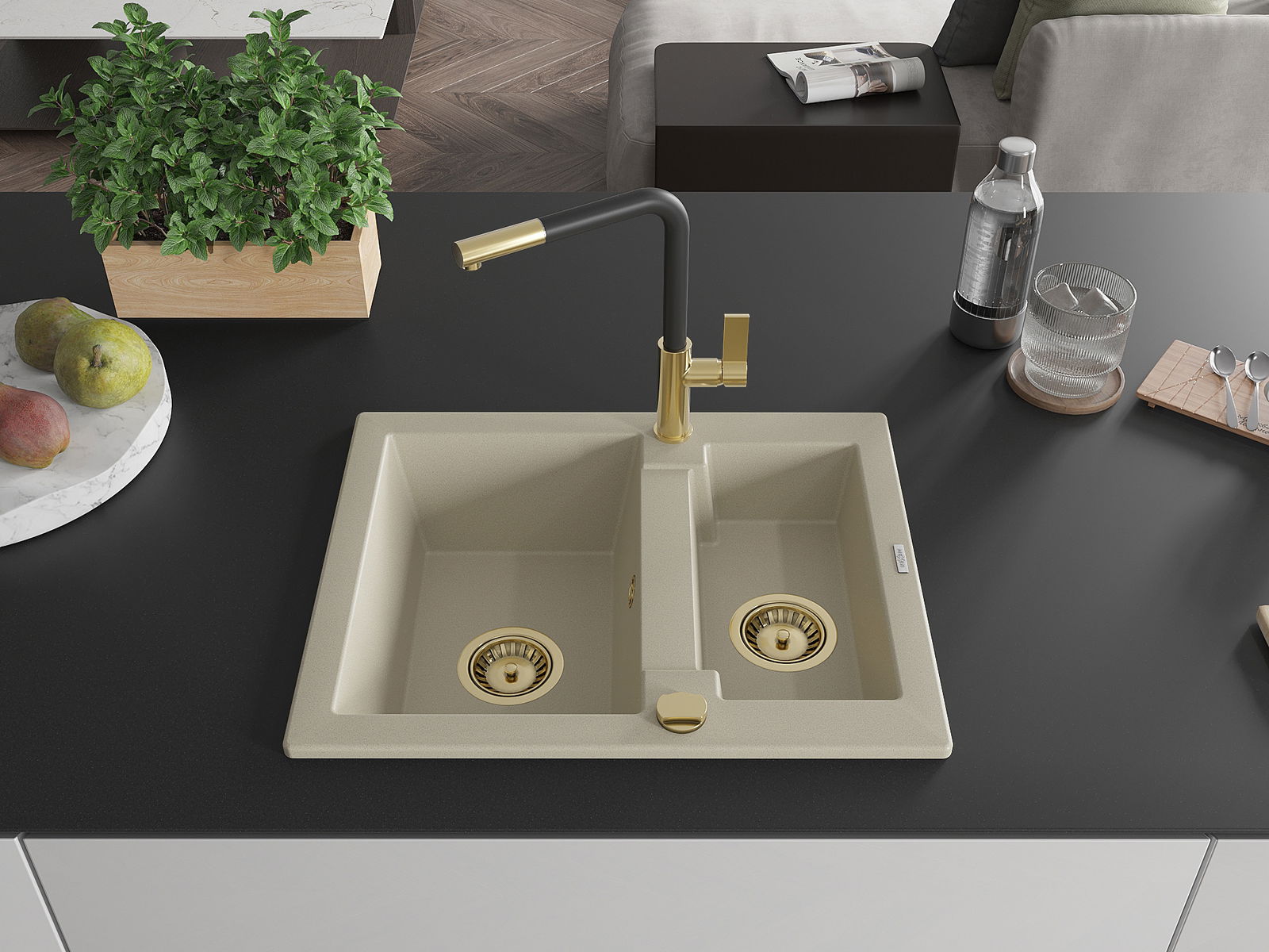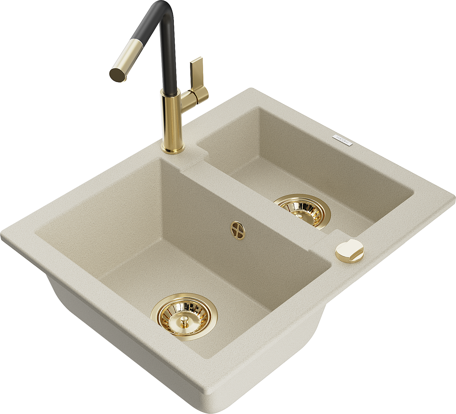 Mexen Carlos fregadero de granito de 1,5 senos con grifo de cocina Flora, beige - 6518-69-670401-57-G