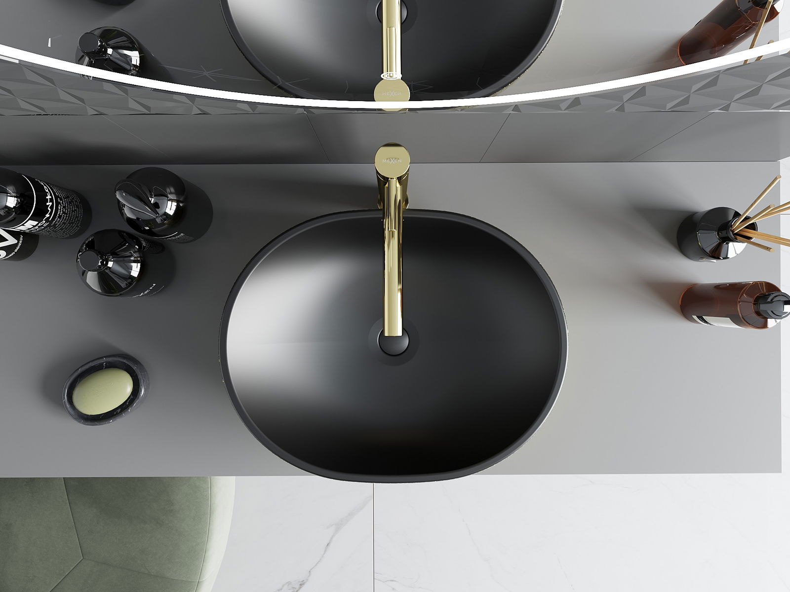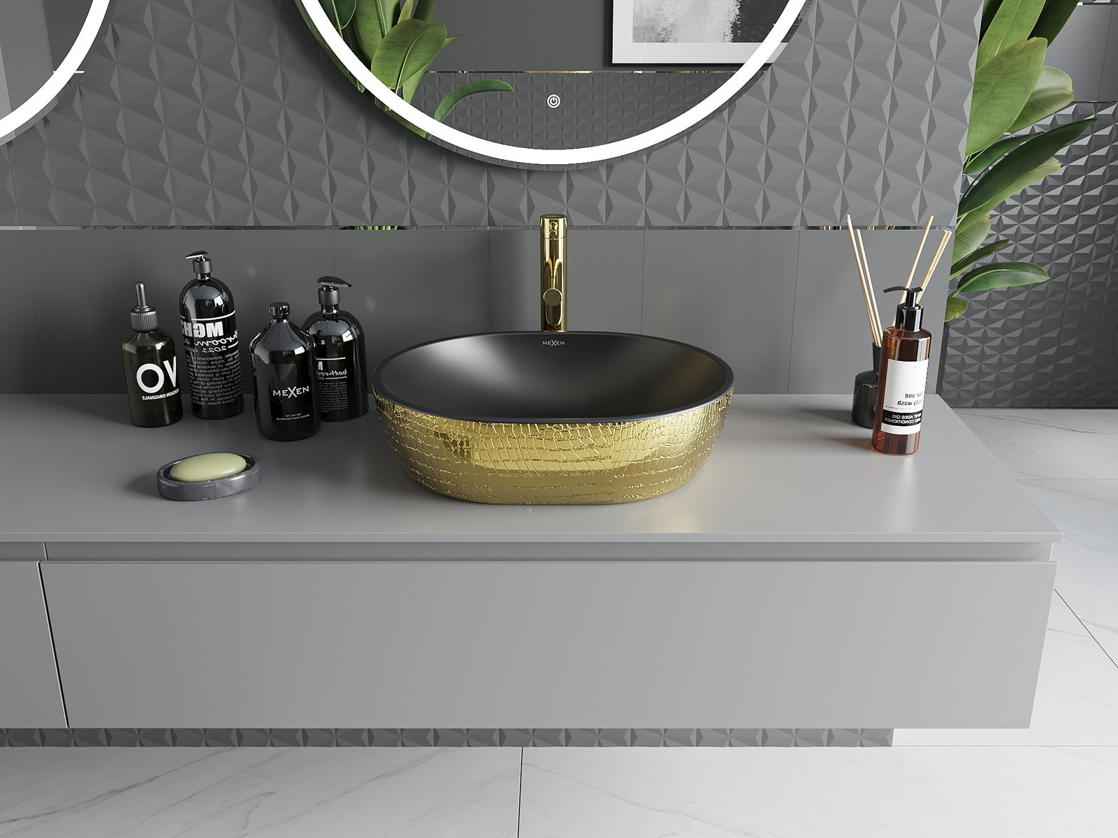 El lavabo sobre encimera Mexen Viki es la solución ideal para baños modernos. Su forma ovalada y el elegante negro mate con patrón dorado de escamas aportan estilo y lujo. Las medidas de 48x35x14 cm y la profundidad de 11,5 cm aseguran comodidad de uso. El producto está hecho de cerámica sanitaria de alta calidad, con superficie pulida, lo que facilita el mantenimiento de la limpieza. Además, el lavabo no tiene orificio de rebose ni para grifo, permitiendo una disposición más minimalista.