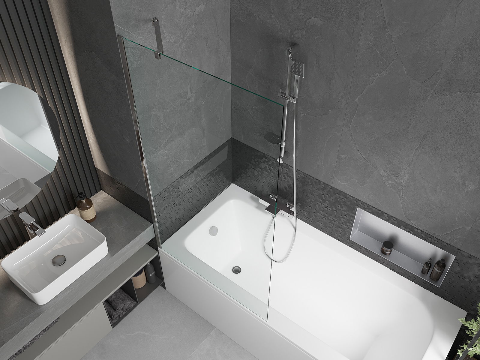 Protección efectiva contra el derrame de agua durante el baño. La mampara tiene juntas que se ajustan perfectamente a la superficie del vidrio y al borde de la bañera. Solución funcional que garantiza seguridad y facilidad de limpieza.