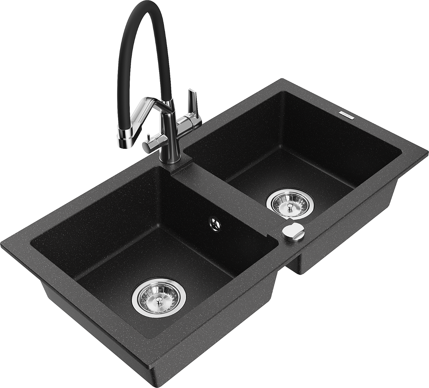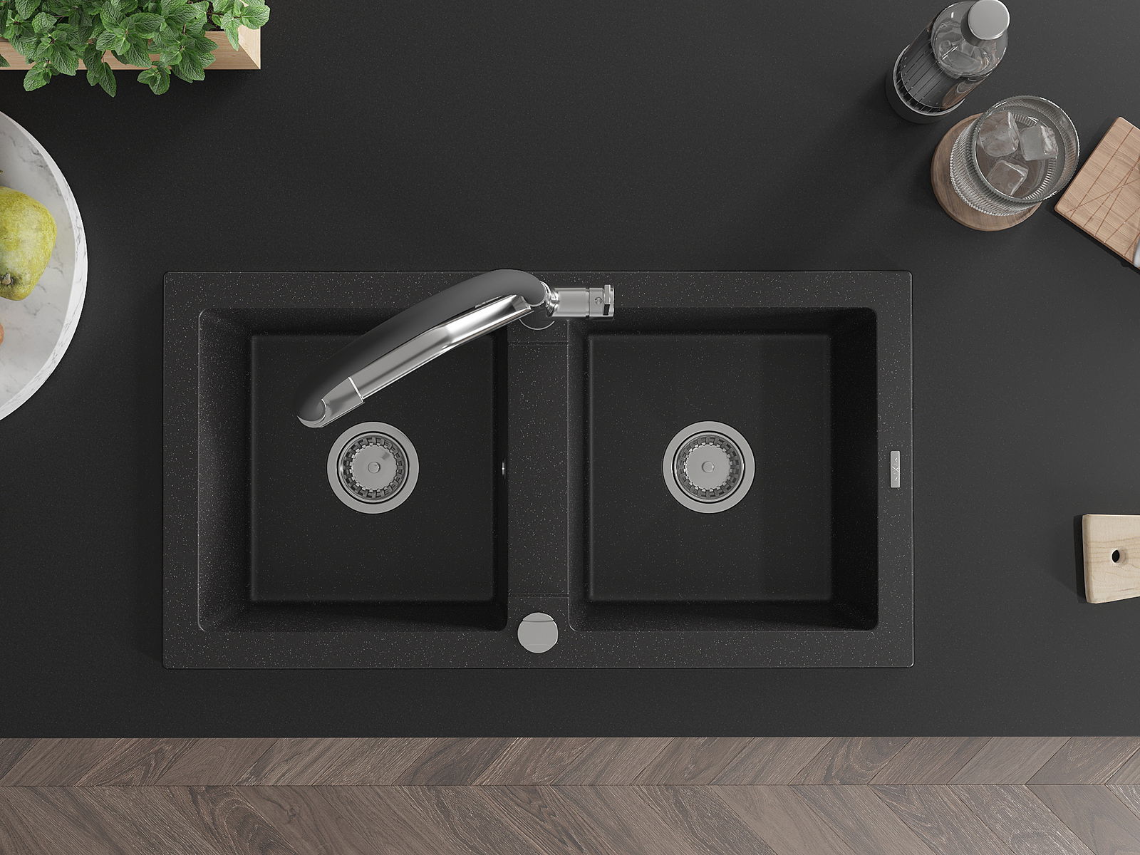 Mexen Mario fregadero de granito de 2 senos con grifo de cocina Duo, negro/metálico plateado - 6504-73-671701-07