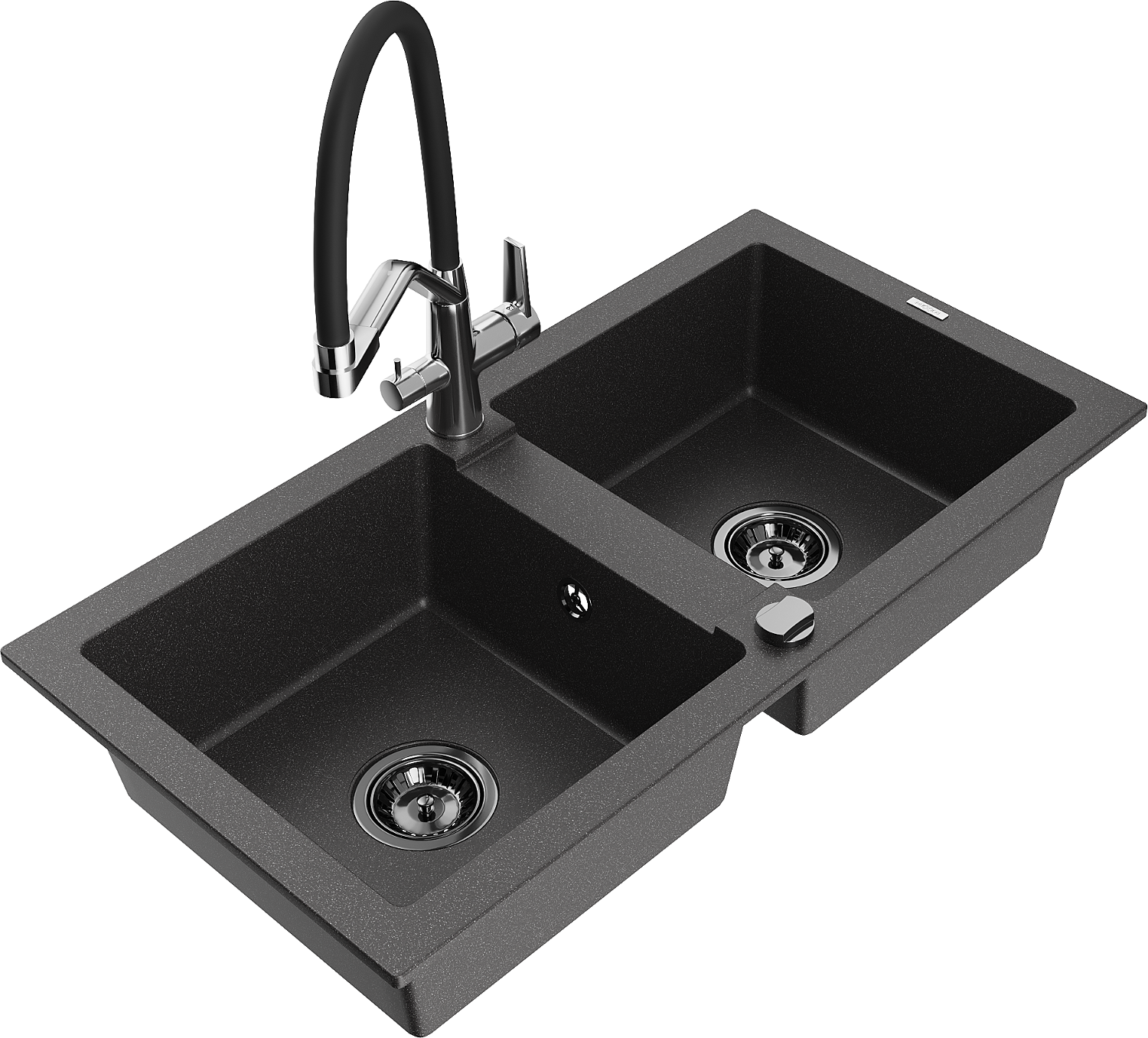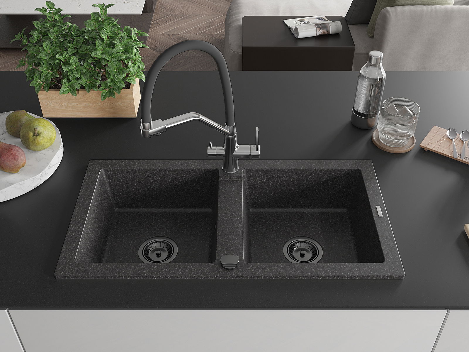 Mexen Mario fregadero de granito de 2 senos con grifo de cocina Duo, negro moteado - 6504-76-671701-07-B