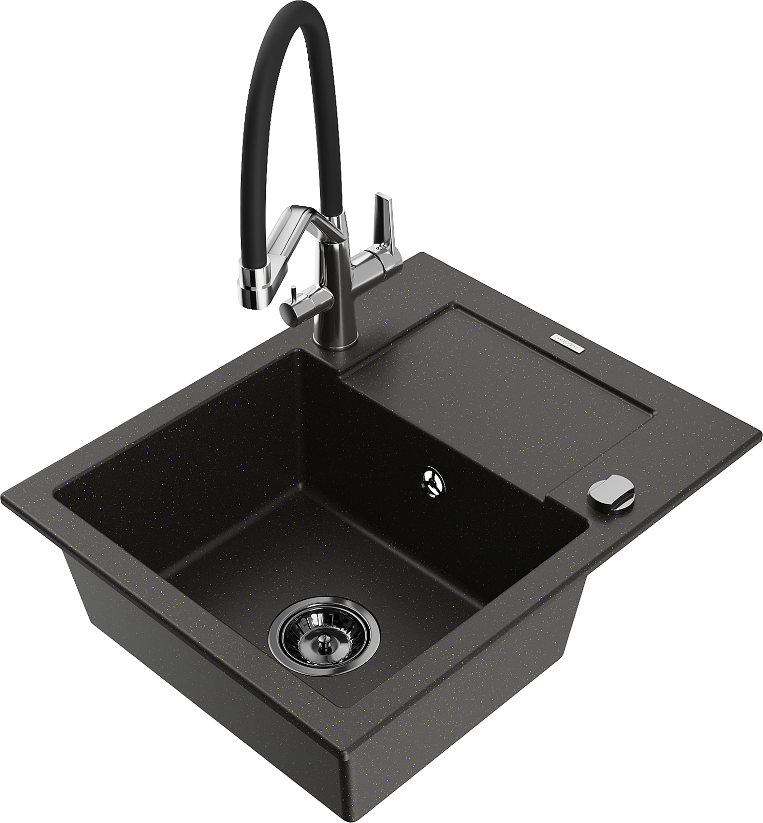 Mexen Enzo fregadero de granito de 1 cubeta con escurridor y grifo de cocina Duo, negro/dorado metálico - 6506-75-671701-07-B