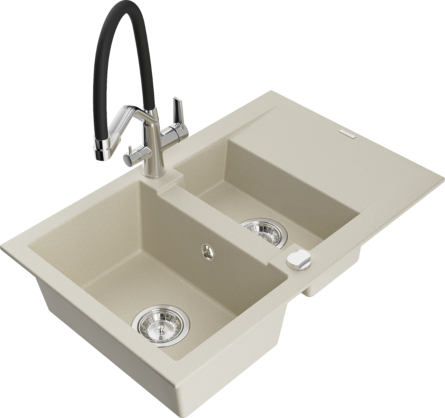 Mexen Gaspar fregadero de granito de 1.5 compartimentos con escurridor y grifo de cocina Duo, beige - 6507-69-671701-07