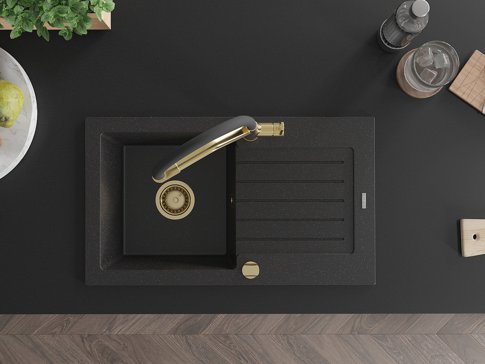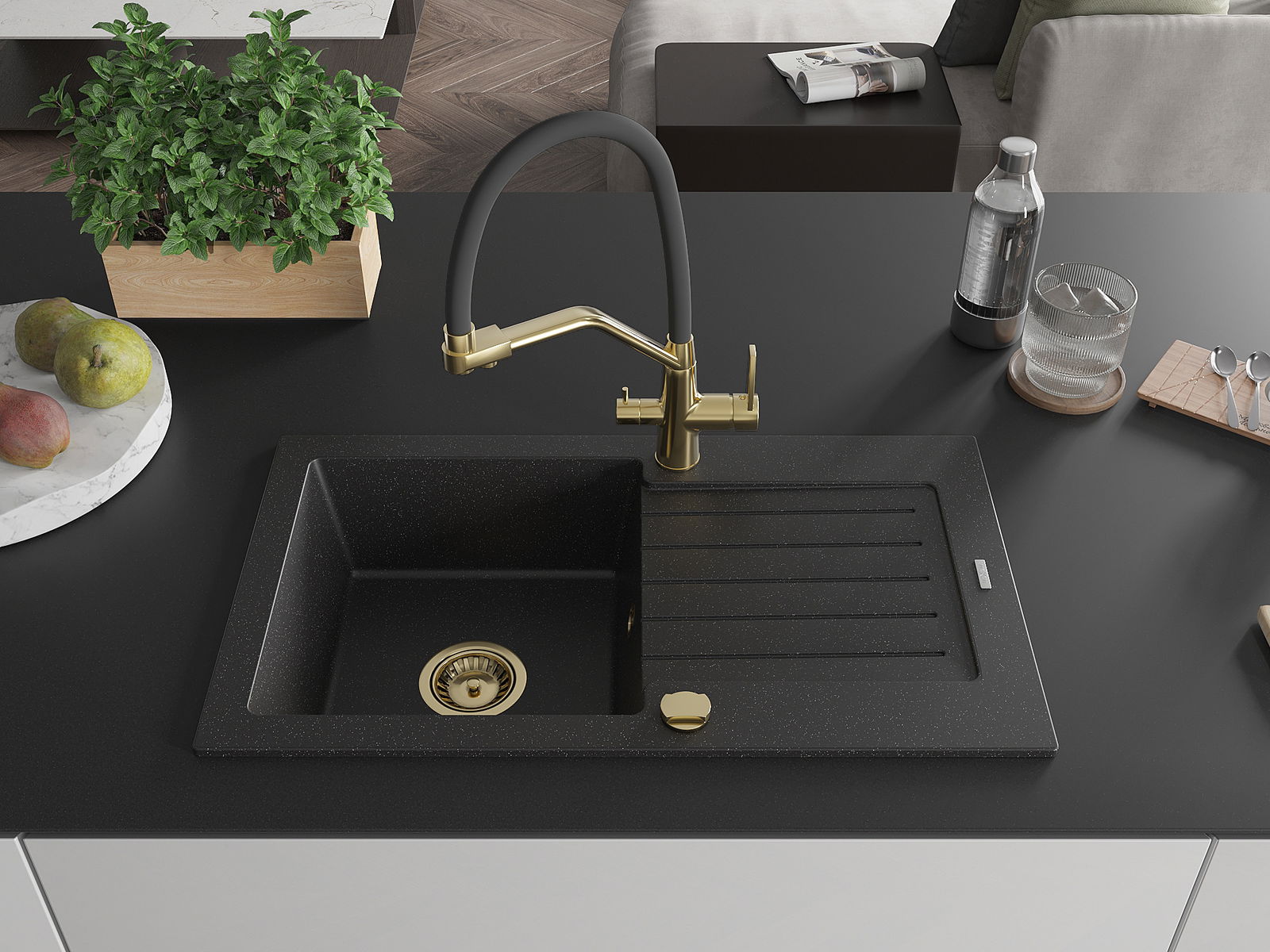 El fregadero está hecho de granito de alta calidad. Es un complemento elegante y, sobre todo, práctico para cualquier cocina, independientemente de su estilo. La alta calidad y durabilidad del granito aseguran un uso prolongado durante años.