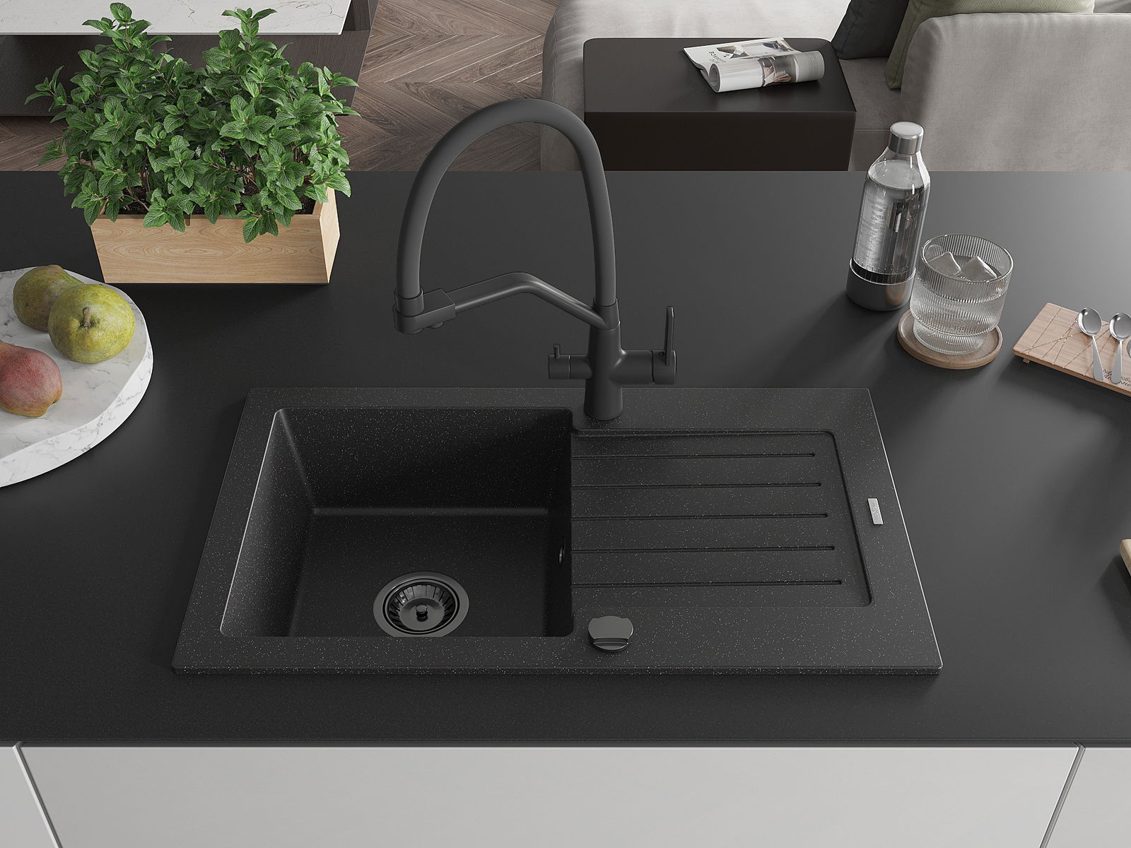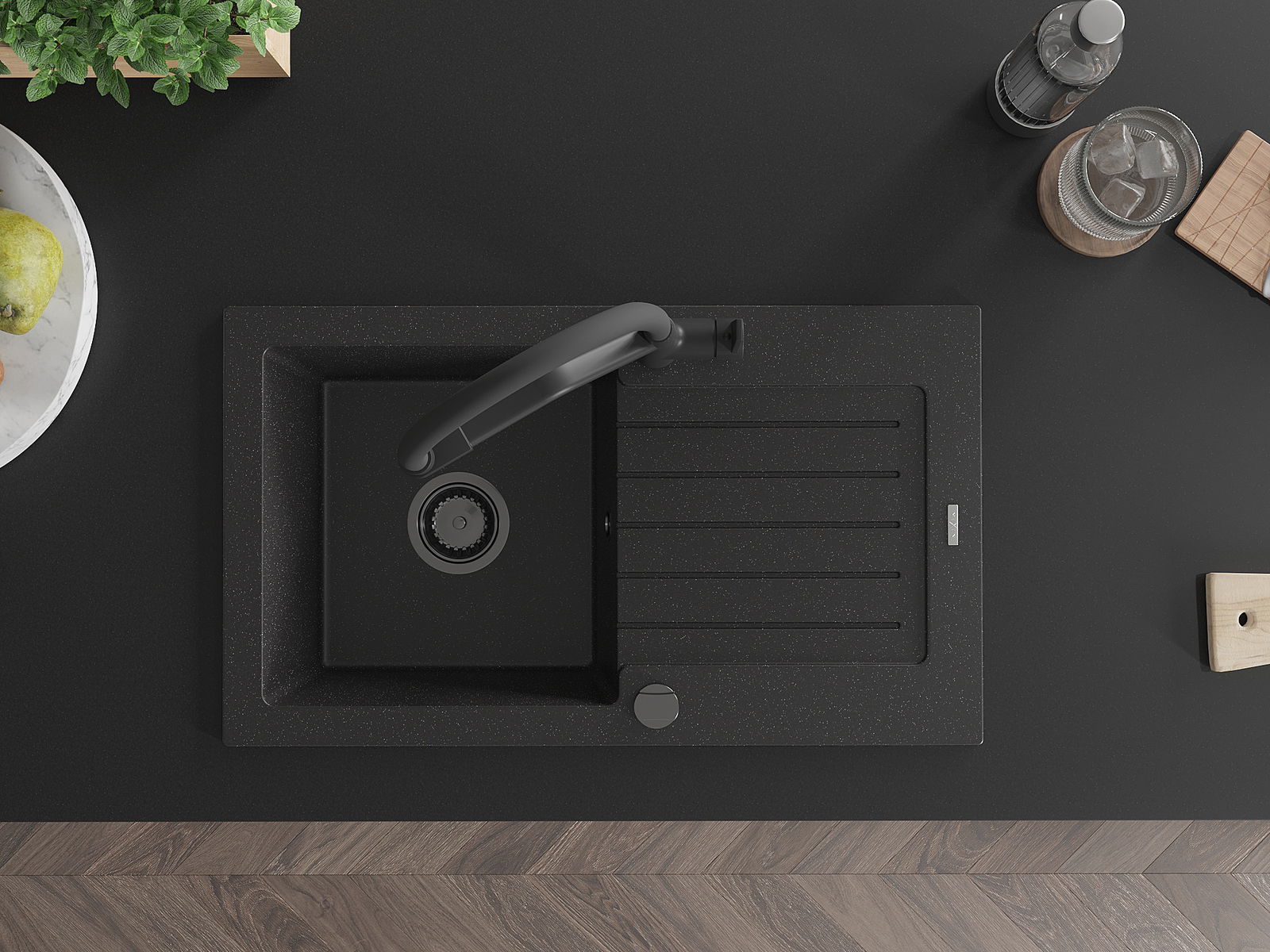 El fregadero está hecho de granito de alta calidad. Es un complemento elegante y, sobre todo, práctico para cualquier cocina, independientemente de su estilo. La alta calidad y durabilidad del granito aseguran un uso prolongado durante años.