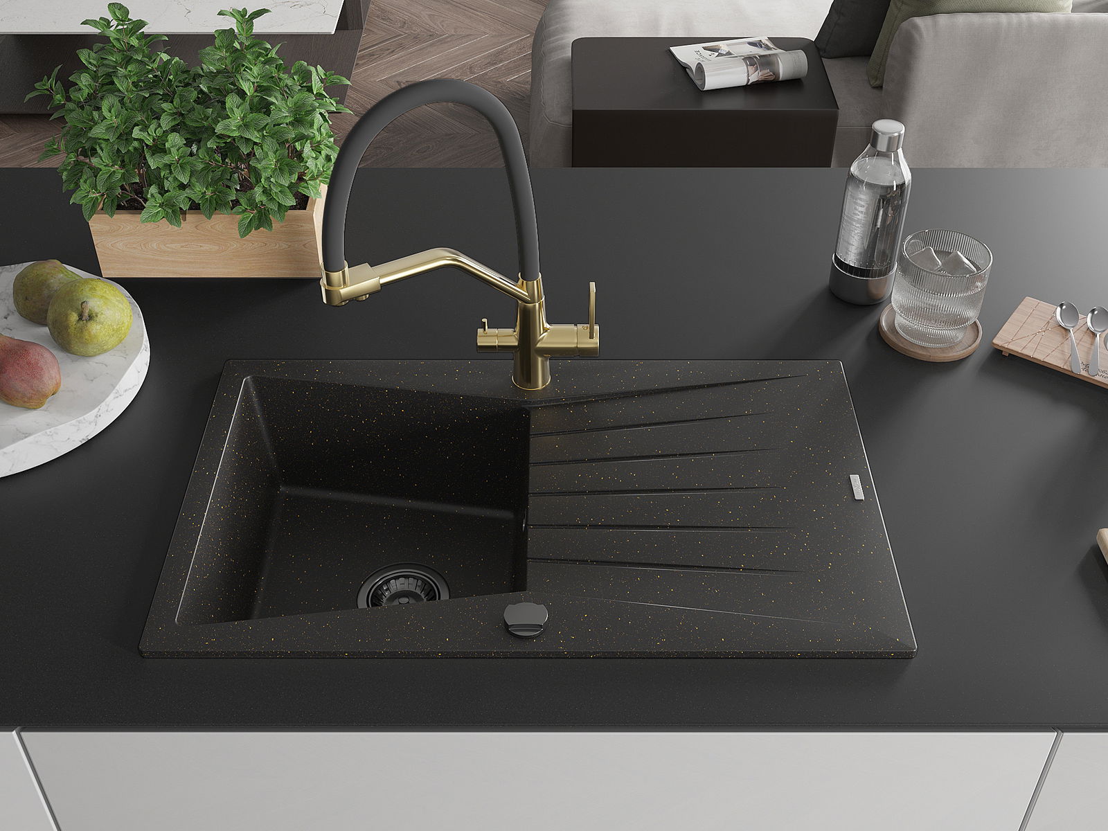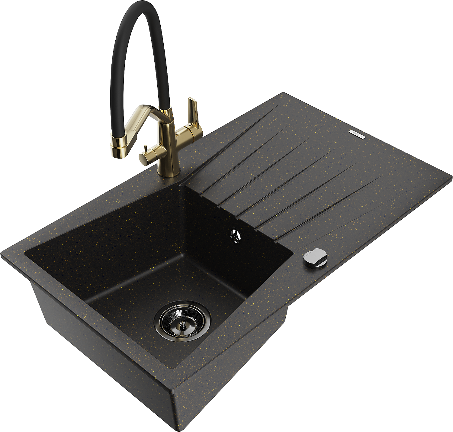 Mexen Cesar fregadero de granito de 1 seno con escurridor y grifo de cocina Duo, negro/dorado metálico - 6514-75-671701-57-B
